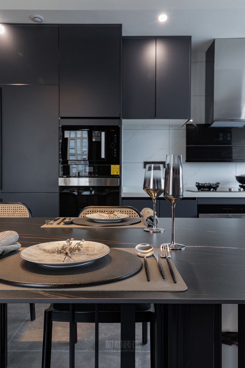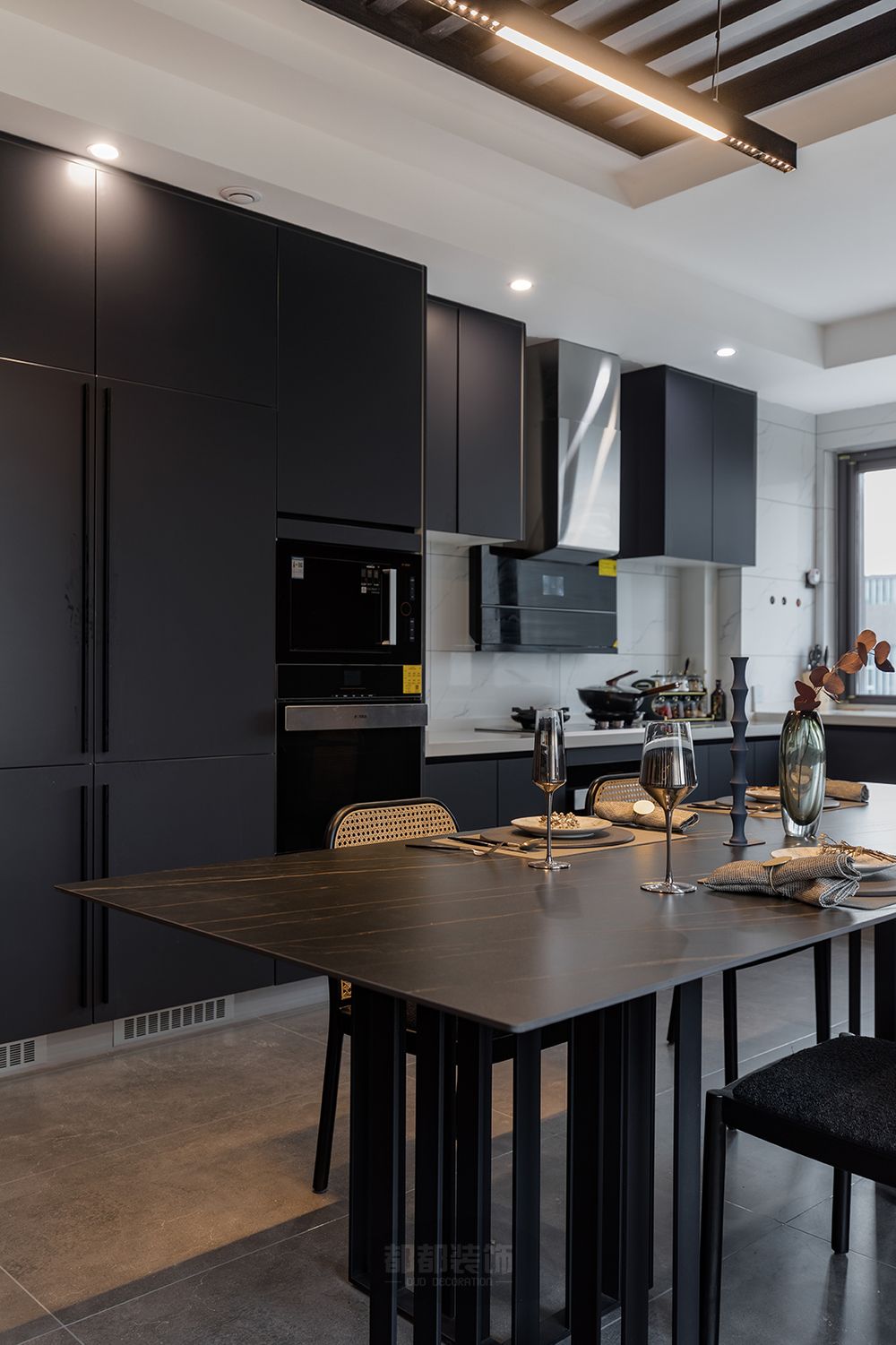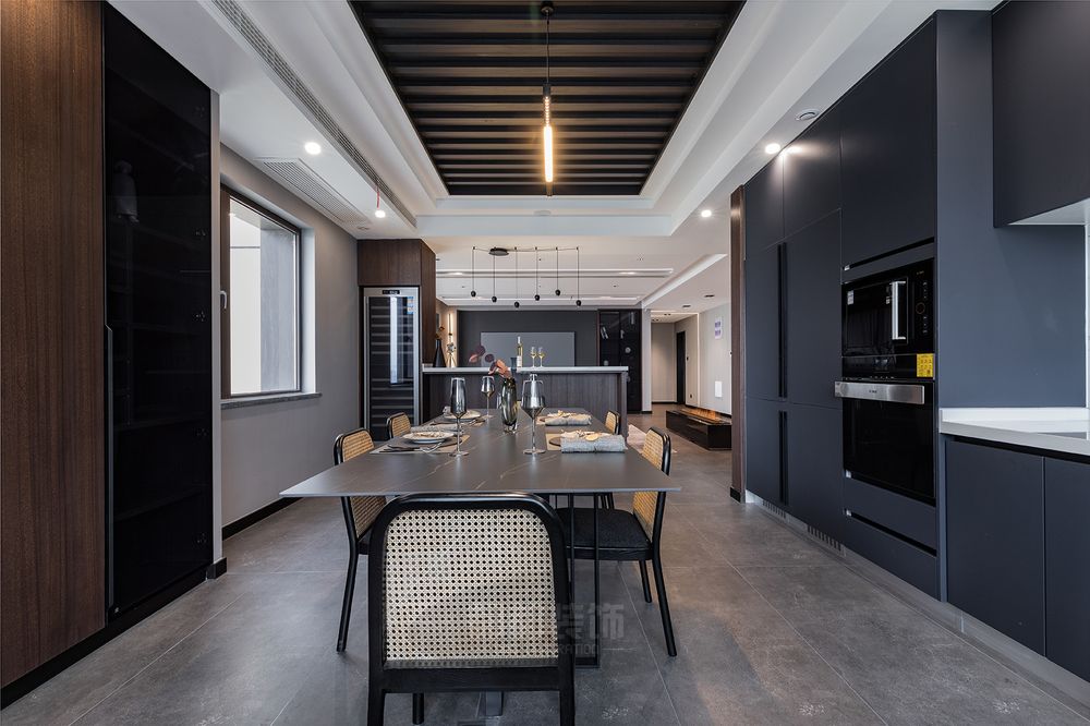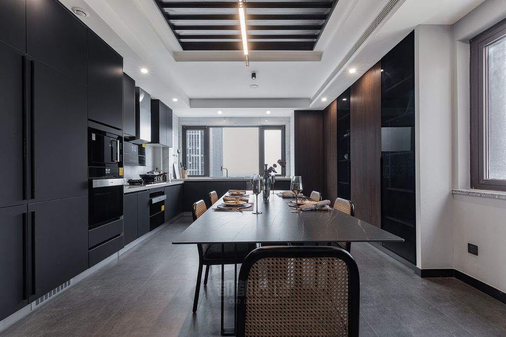 ▲ 厨房与餐厅均为开放式,亚光黑的饰面在视觉上延伸着空间,为这一处空间营造一道沉稳而坚定的背景,它不跳跃,而又塑造着空间的层次,模糊了空间的界限,仿佛映照着一个更为深层的空间领域。