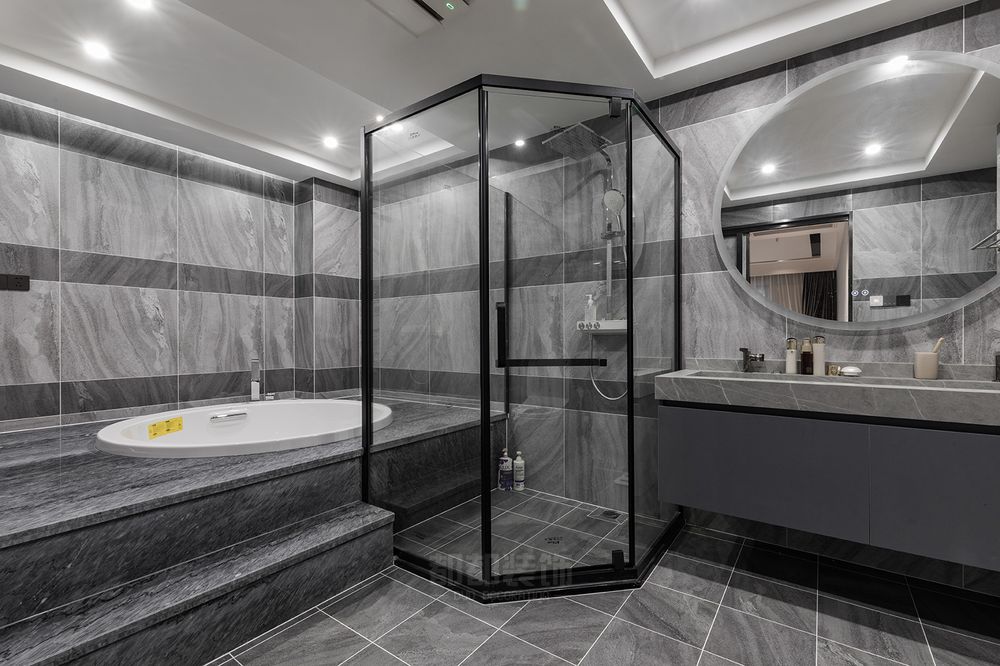 ▲ 卫浴宽敞舒适,灰色大理石的层次感恰到好处,浴缸与淋浴房兼备。