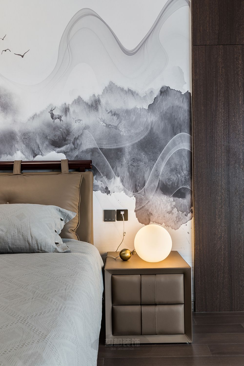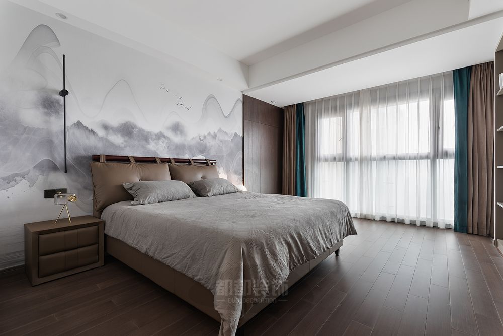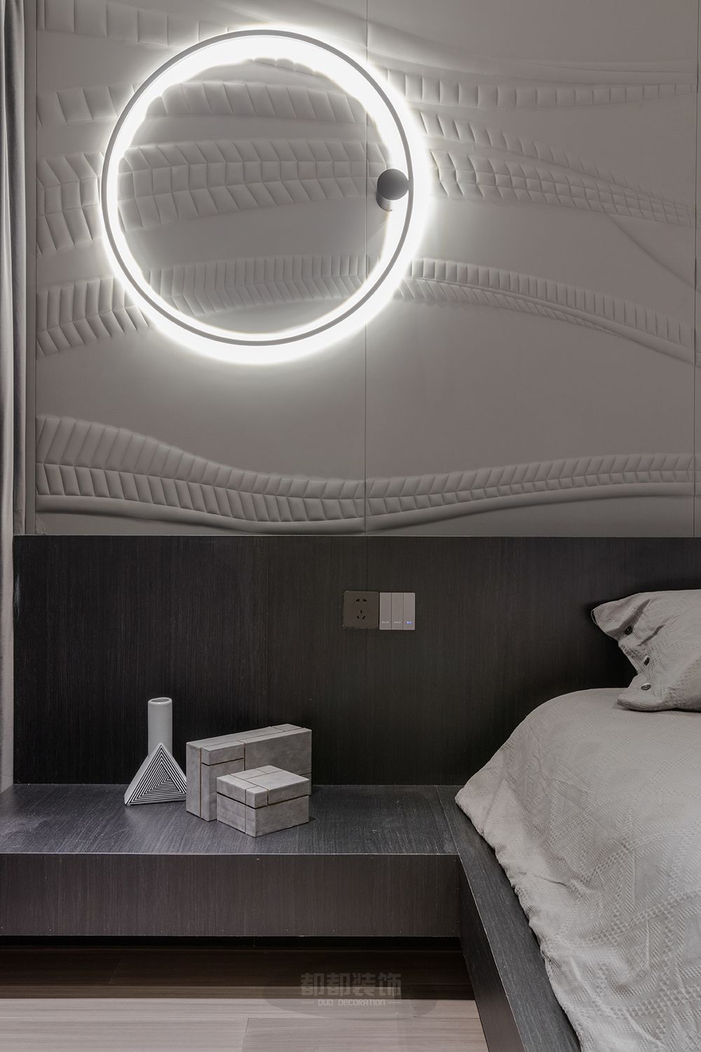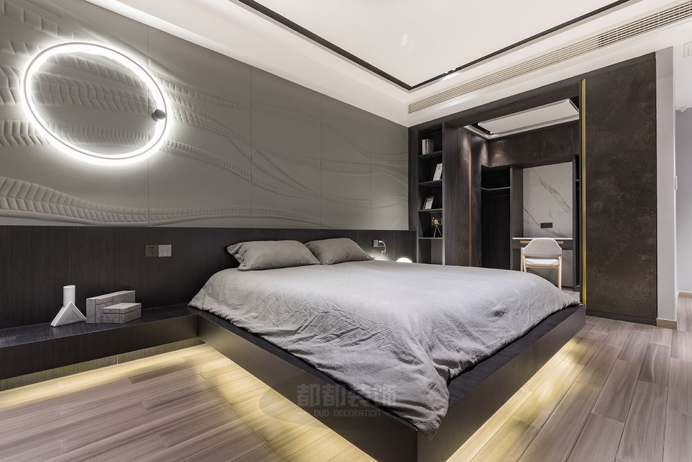 ▲ 卧室延续中性、克制的色调,空间的柔软之处体现于家具、床品的品质,也构建于身体的舒适与放松。悬空式的床体加上灯光设计,现代感十足。