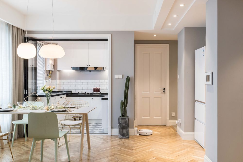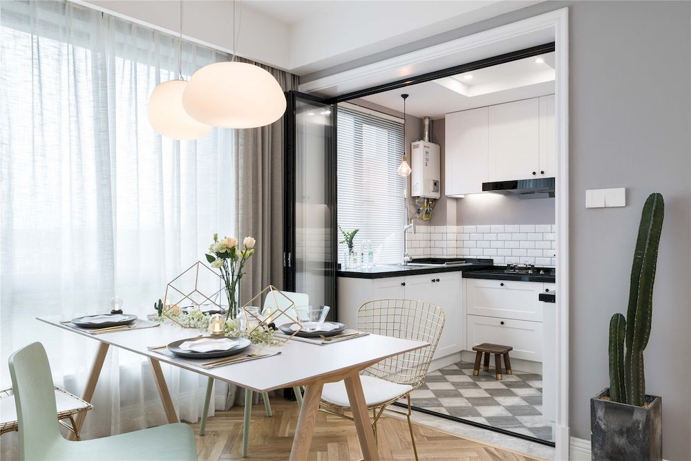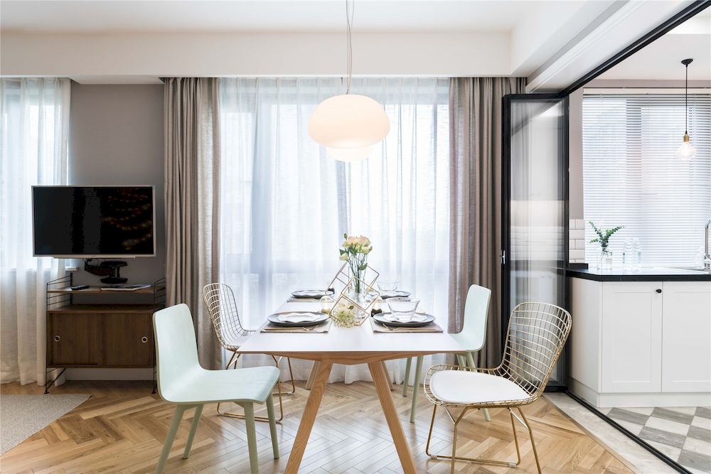 餐厅与客厅横厅的格局,餐桌就布置在沙发后方,整体空间宽敞而舒适。