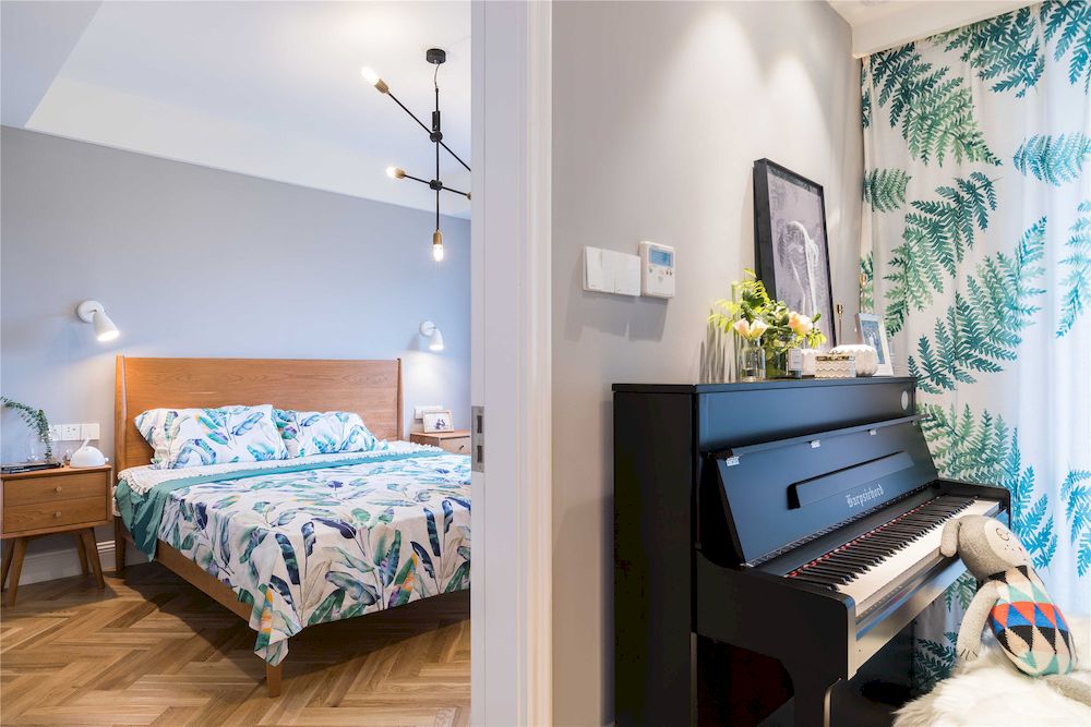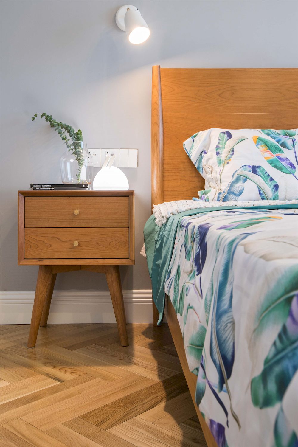卧室床头墙以灰色+白色硬包的背景墙,结合一张灰绿色布艺靠背床,床头柜的精致小摆饰,都让空间显得格外的华丽情趣。