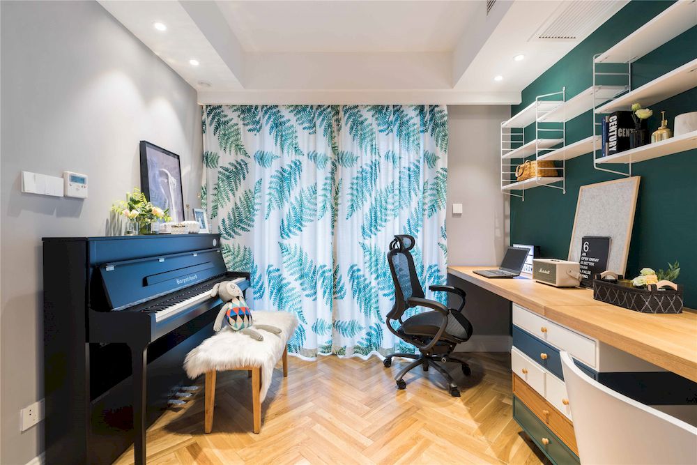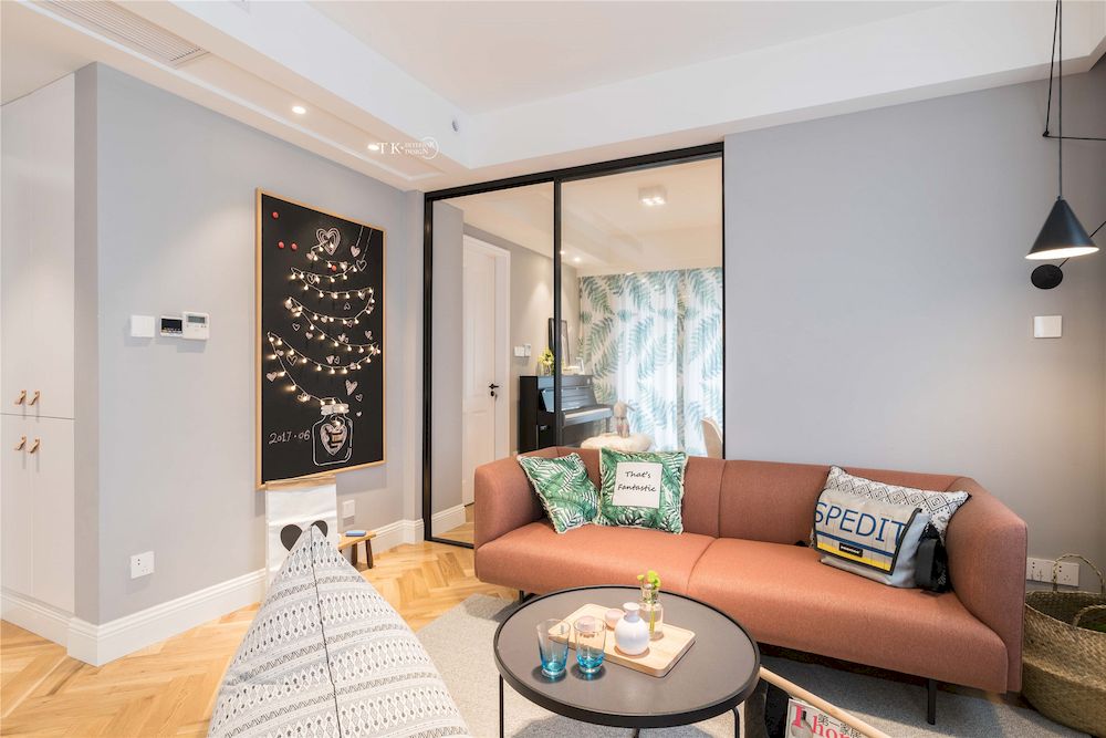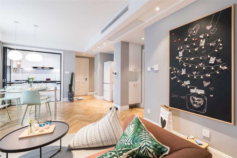 电视墙以定制柜作为主体,左侧加入了几个黑色的开放格架,摆上雅致的装饰品,让空间显得现代优雅而大气。