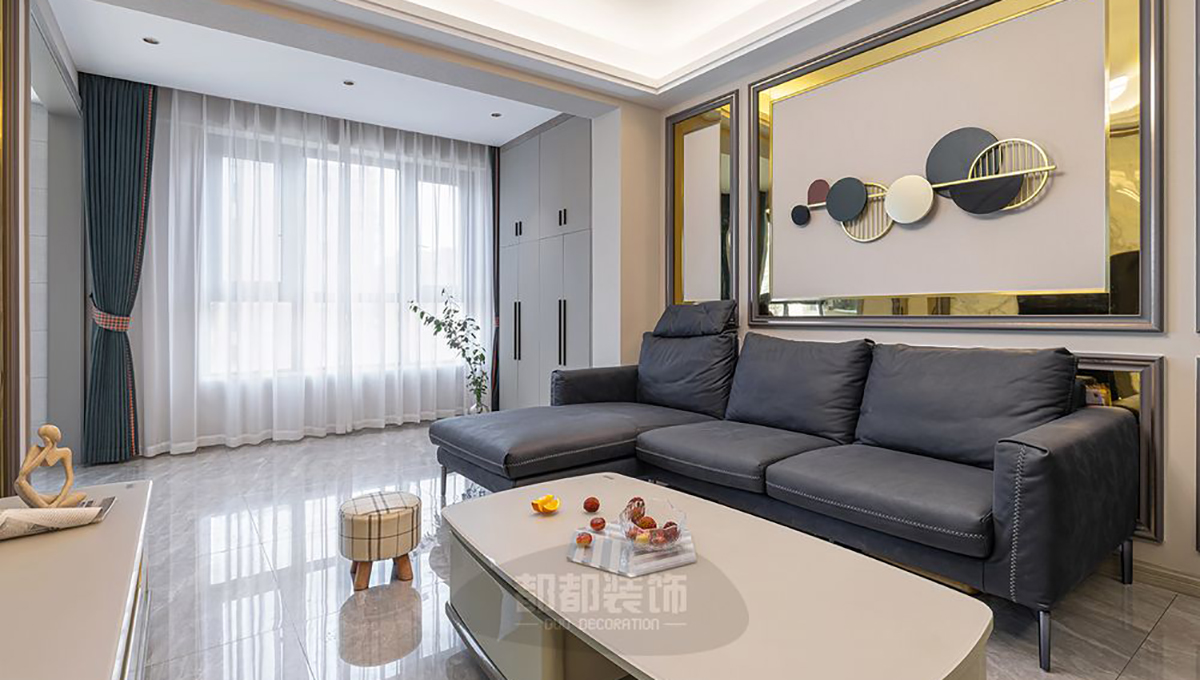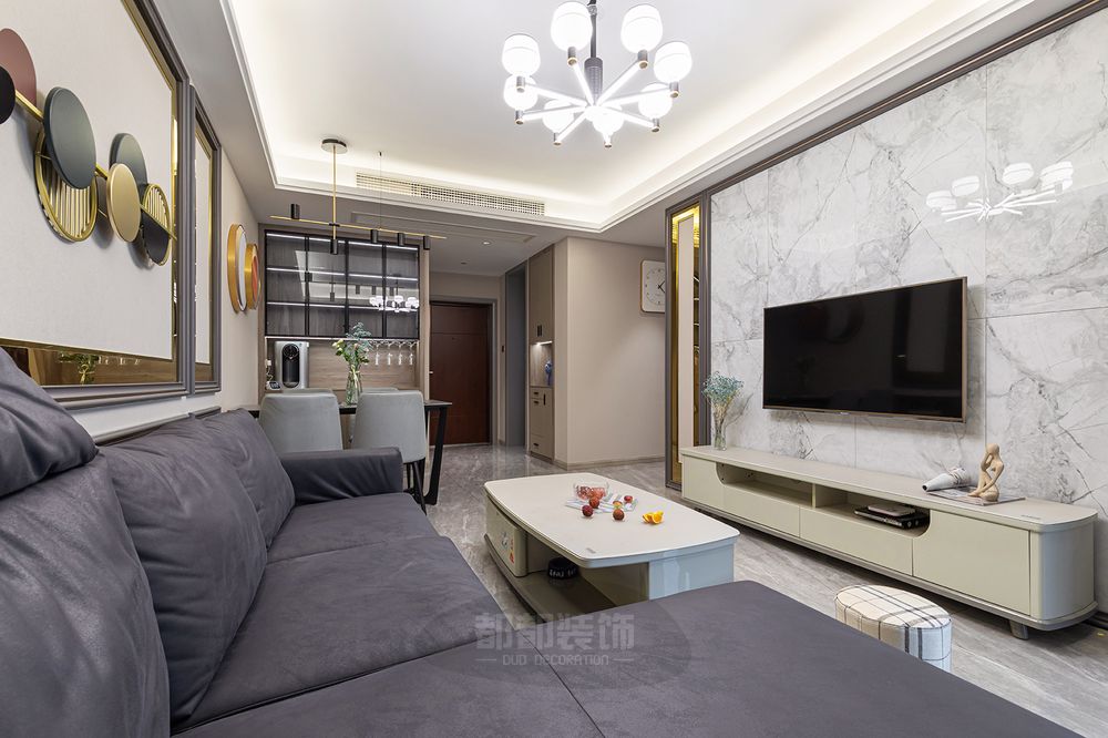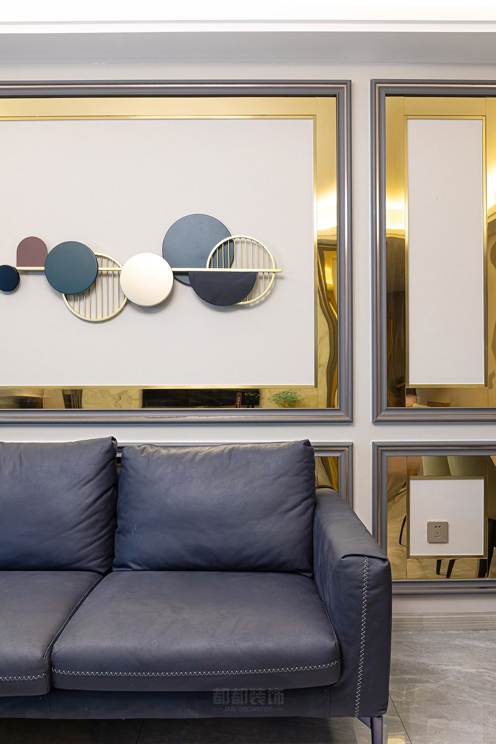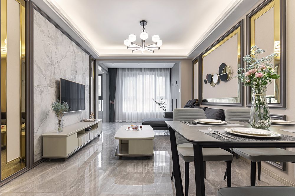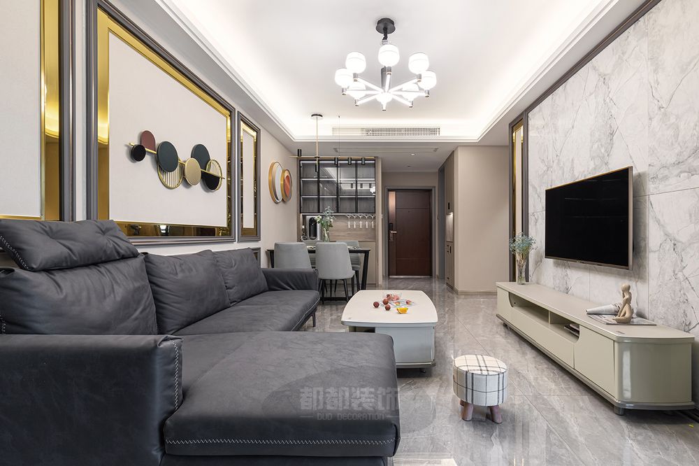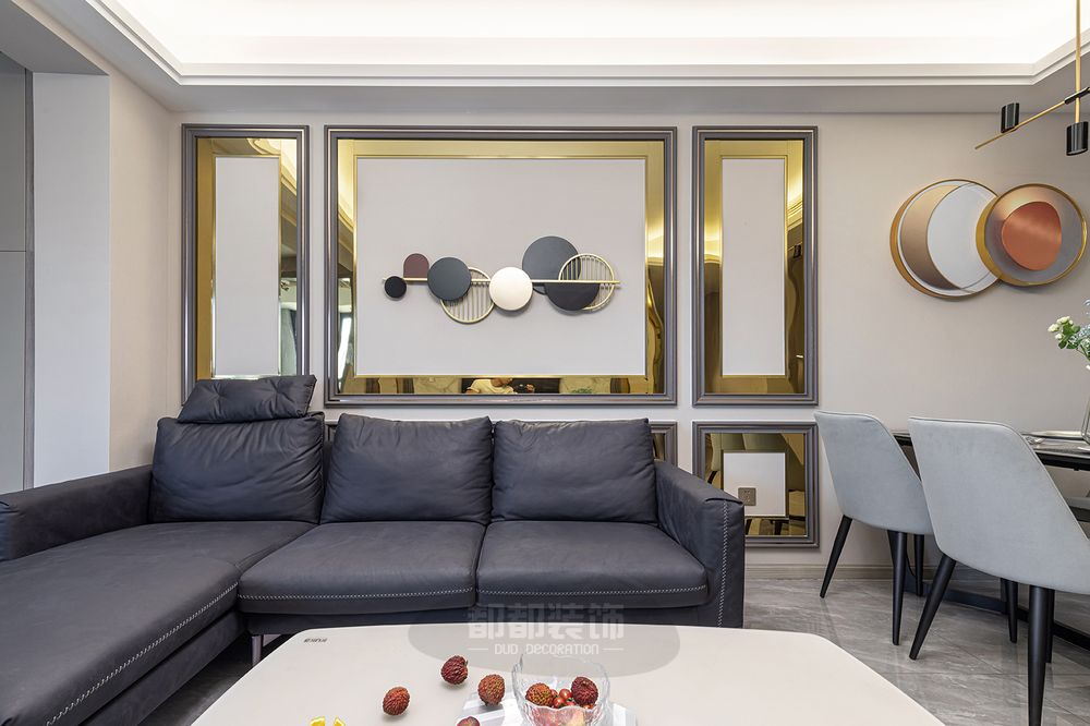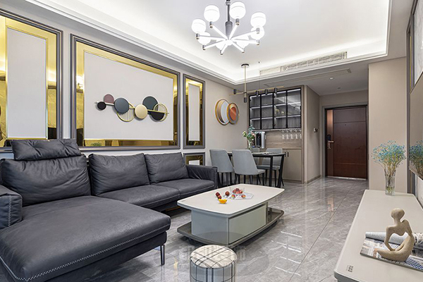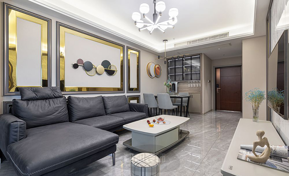 ▲ 采用大幅度的金属线条装饰空间,杏色与大理石纹结合,体现出强烈的简约欧式风格,软皮沙发颜色沉稳,柔软舒适,可容纳多人。