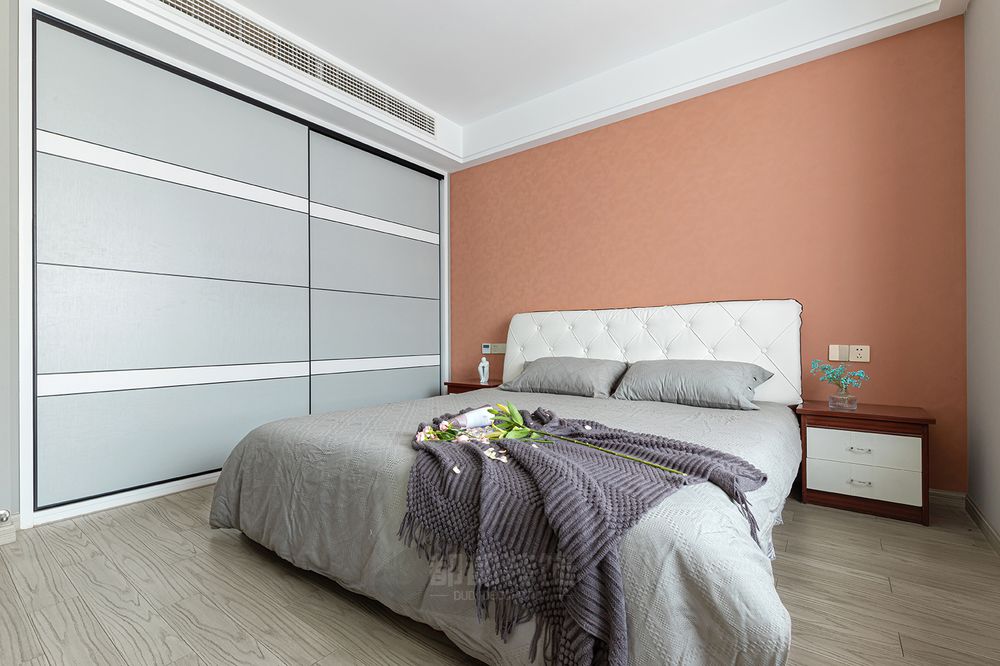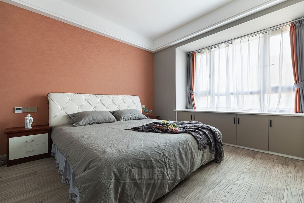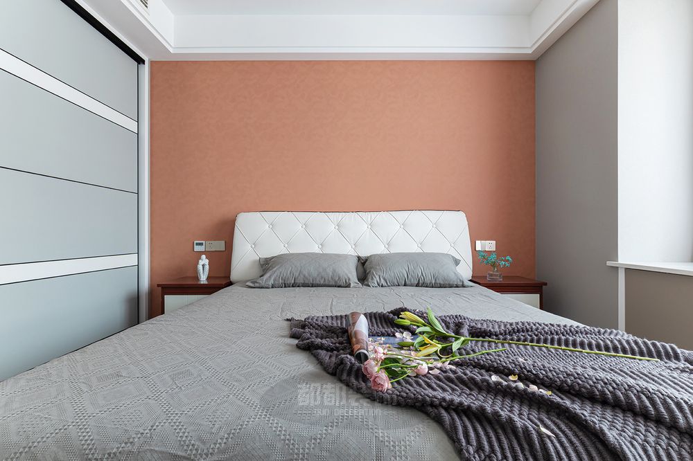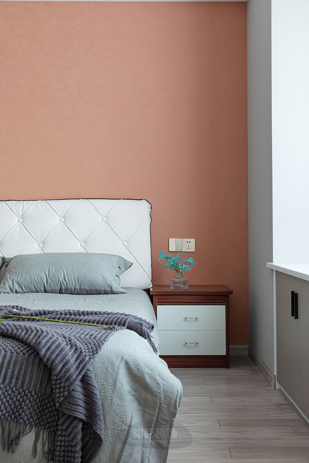 ▲ 步入主卧,精致柔软的织物床品使得细节处更显尊贵,橙粉色提亮了整个空间的调性,典雅而错落有致。