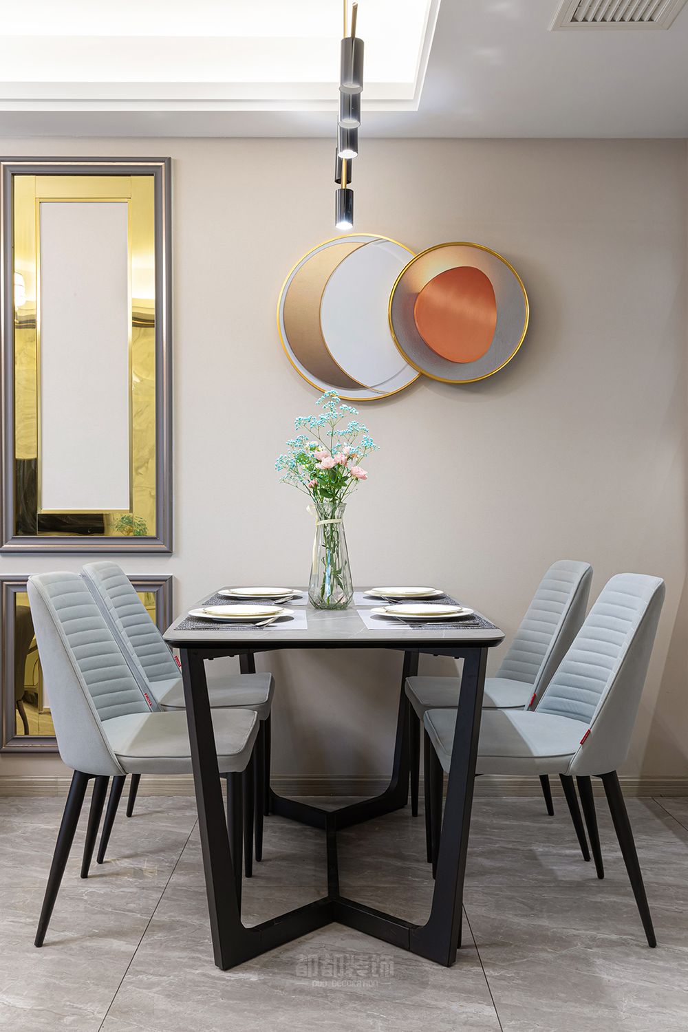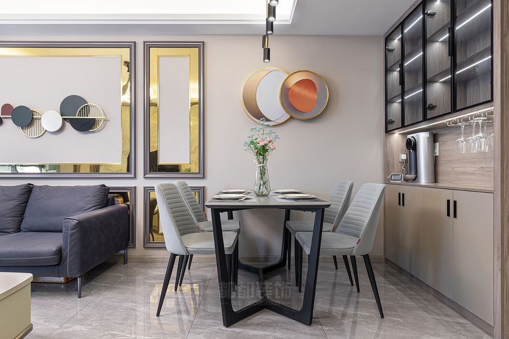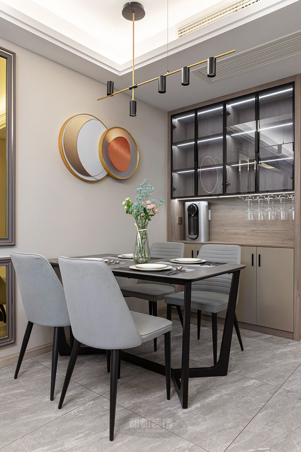 ▲ 人间烟火气,最抚凡人心,客餐厅于同一空间内,餐厅小巧精致,几何线条的餐桌椅简约时尚,酒柜储物柜灯光设计富有现代感。