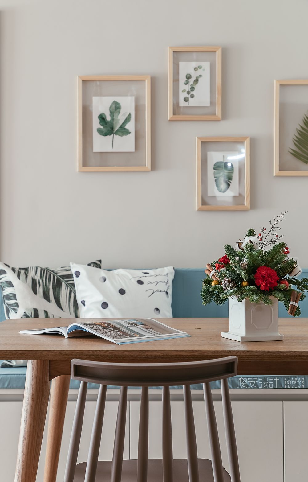 面两道木色也划分出了留白的空间,配合性地摆上餐桌餐椅,用餐时光也显得更有仪式感了。