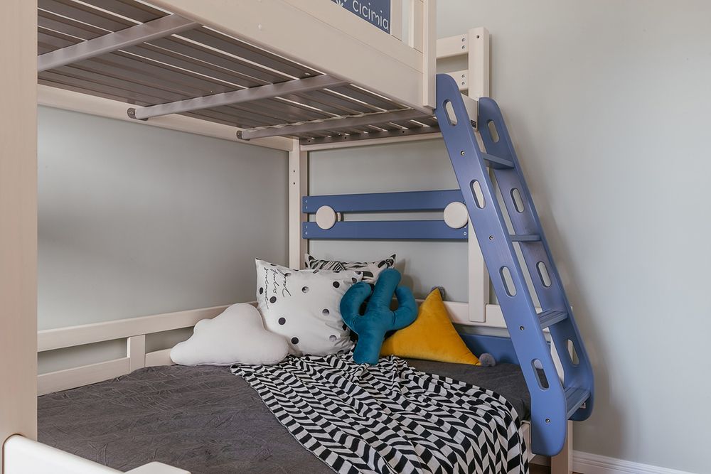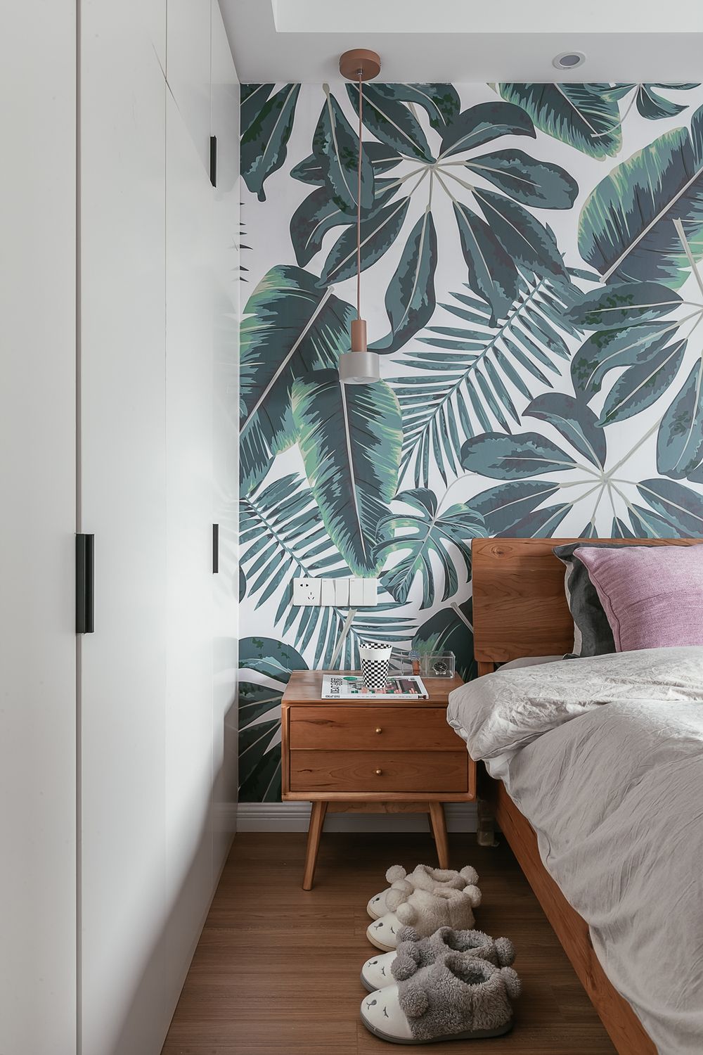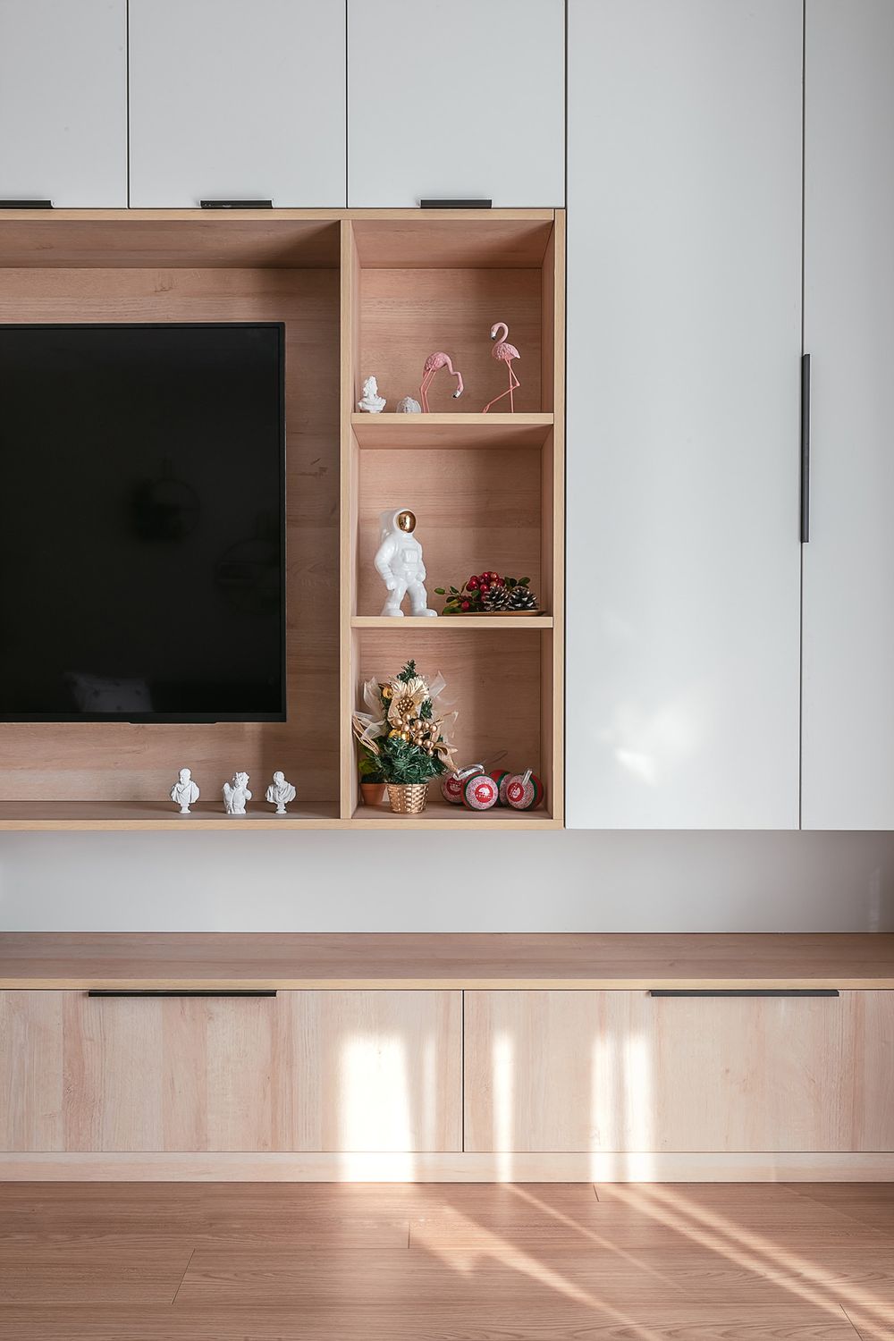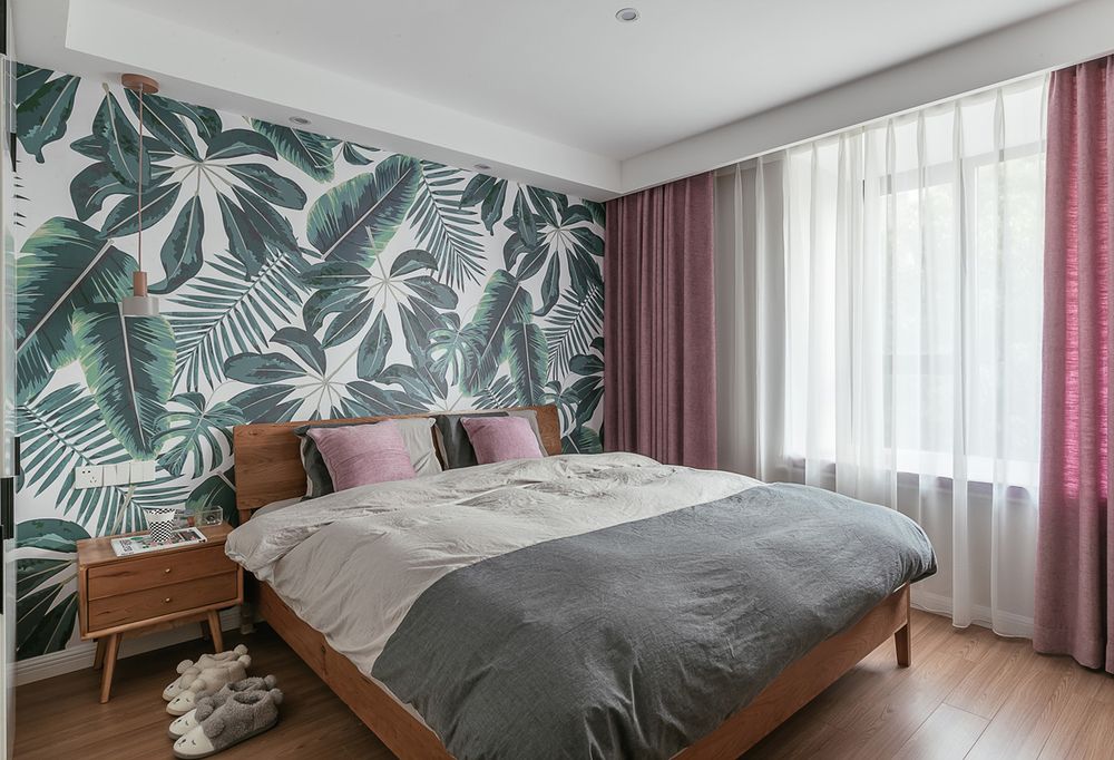 床头的大白墙由收纳架作为装饰,左侧梳妆台和右侧床头柜都为悬空原木柜,营造更轻快的视线。而梳妆台上方增加了白柜的收纳,一方面可以放些化妆品,另一方面也弱化了横梁的存在感。
