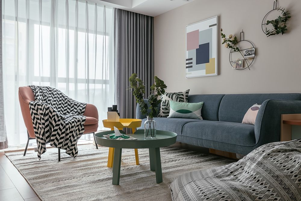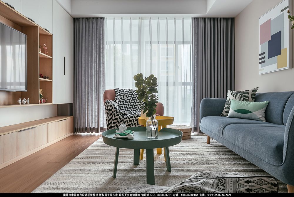 客厅采取树枝吊灯+射灯的照明,电视墙由白色+黄色的柜体打造,而沙发墙则简单地挂两幅雅致装饰画,显得简单有序,特别有生活气息。