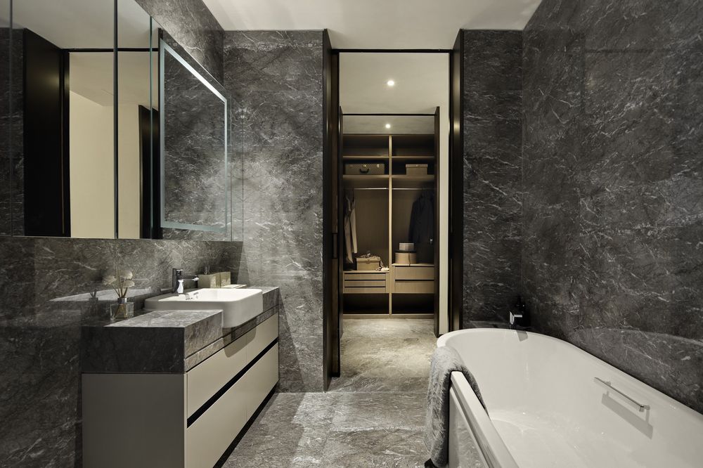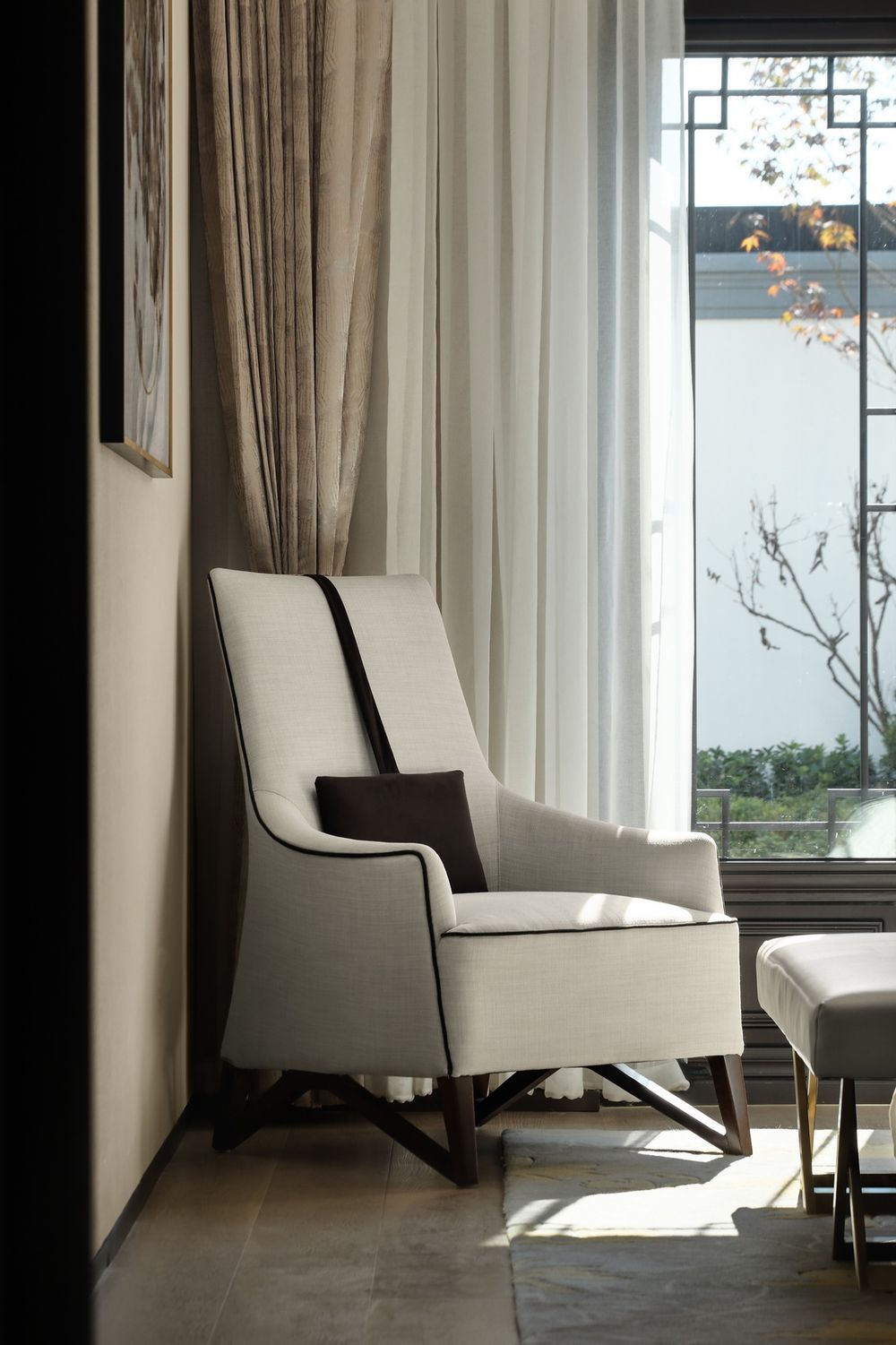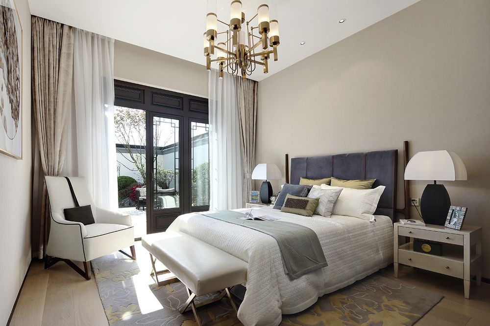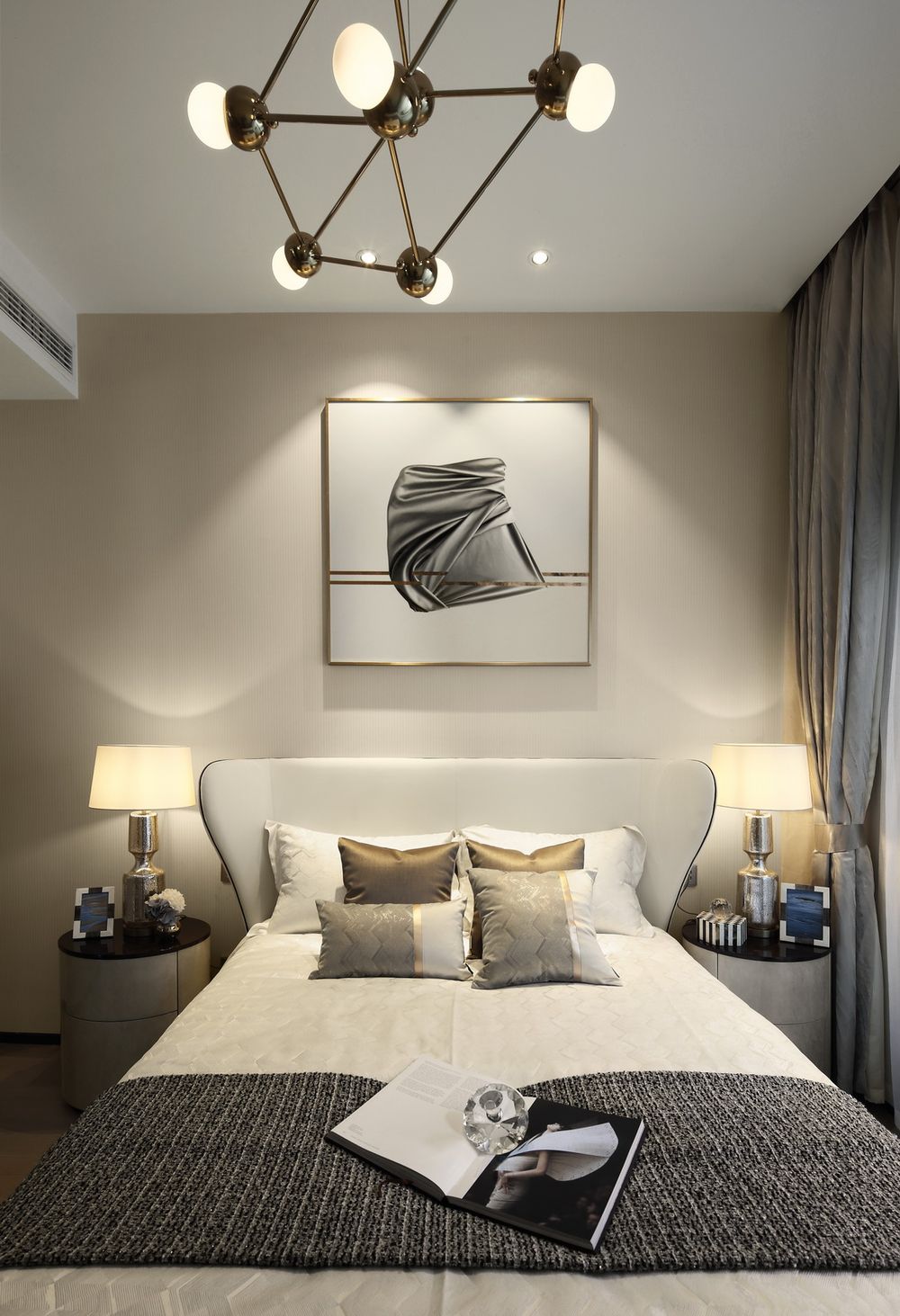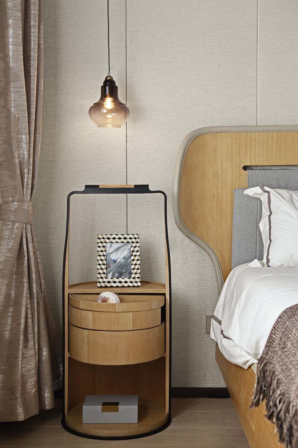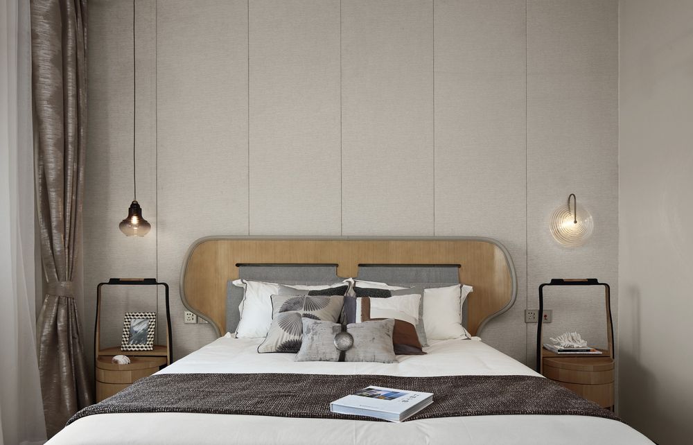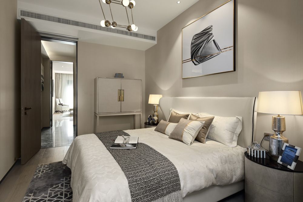 卧室则同样延续空间主打色,保留空间的通透流畅。大面积留白的墙面,搭配远山灰门板和玻璃掩门,既突出了空间的质感,也使其感觉并不过于冷清,低调的宣扬着主人的个性。