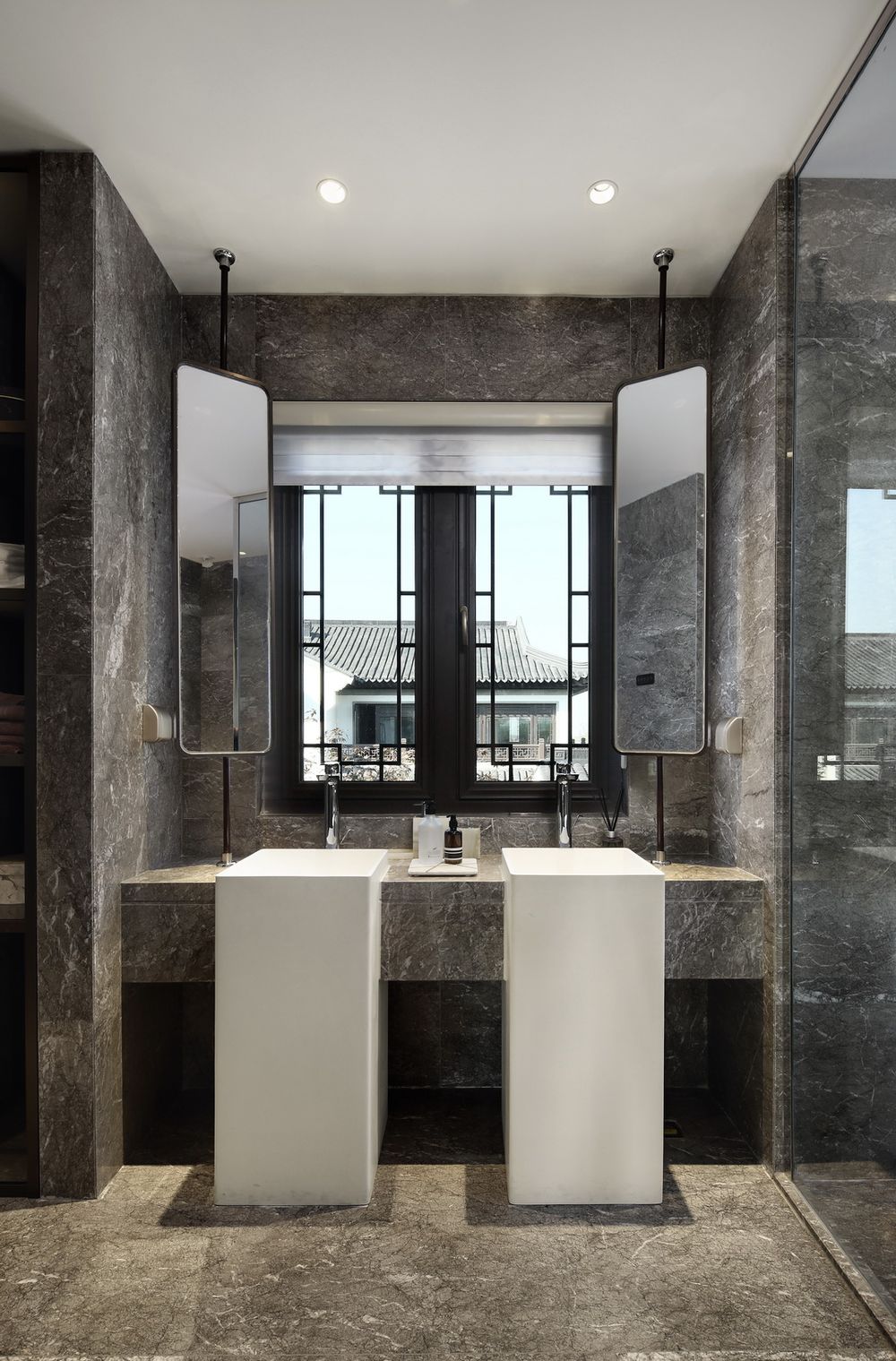 主卫做了三分离的基础设计,墙体的分色设计呼应了卧室墙板的暖粉色。