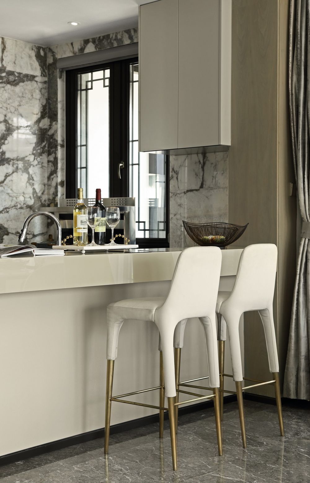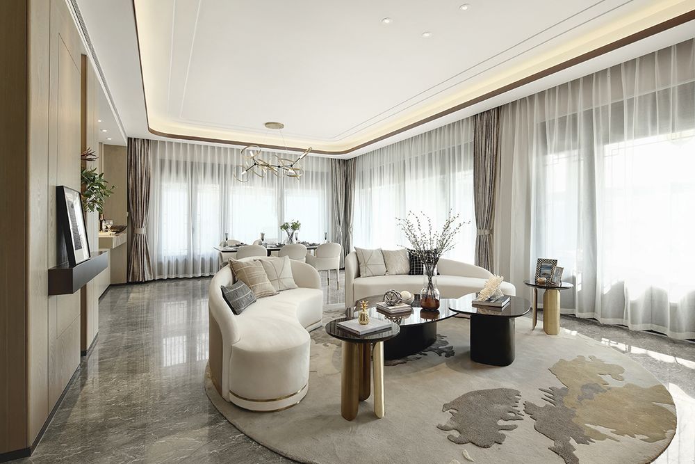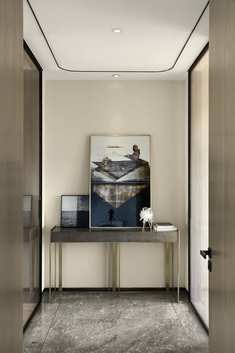 客厅低调奢华中暗藏精致感,大理石、金属和布艺沙发元素等不同属性的材质交织碰撞,空间大而不空,简而不陋。底部留空藏灯带,见光不见灯,营造空间悬浮感,细节满分,更显高级!