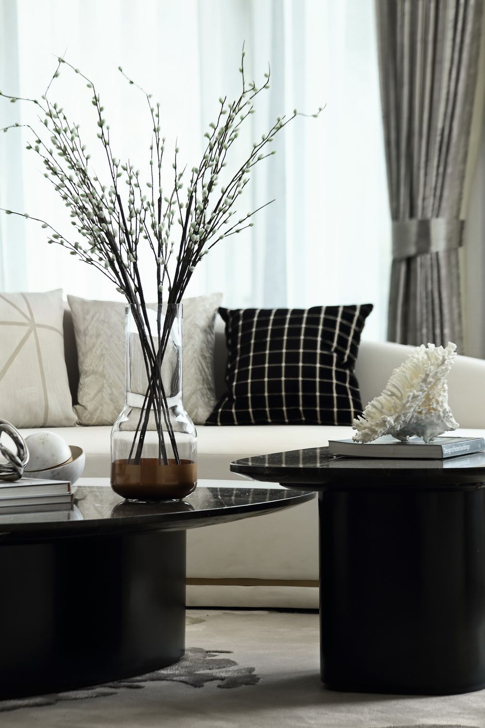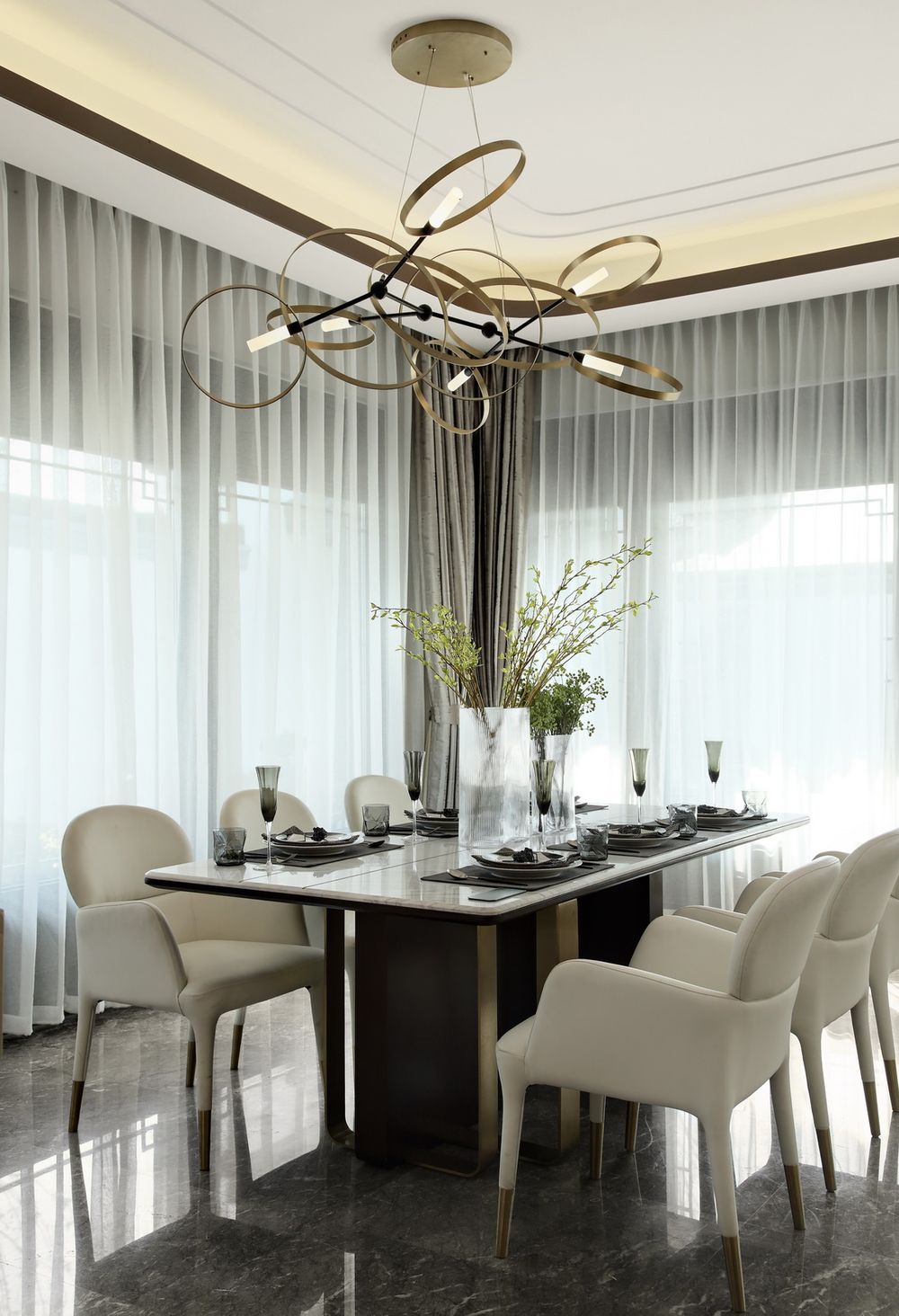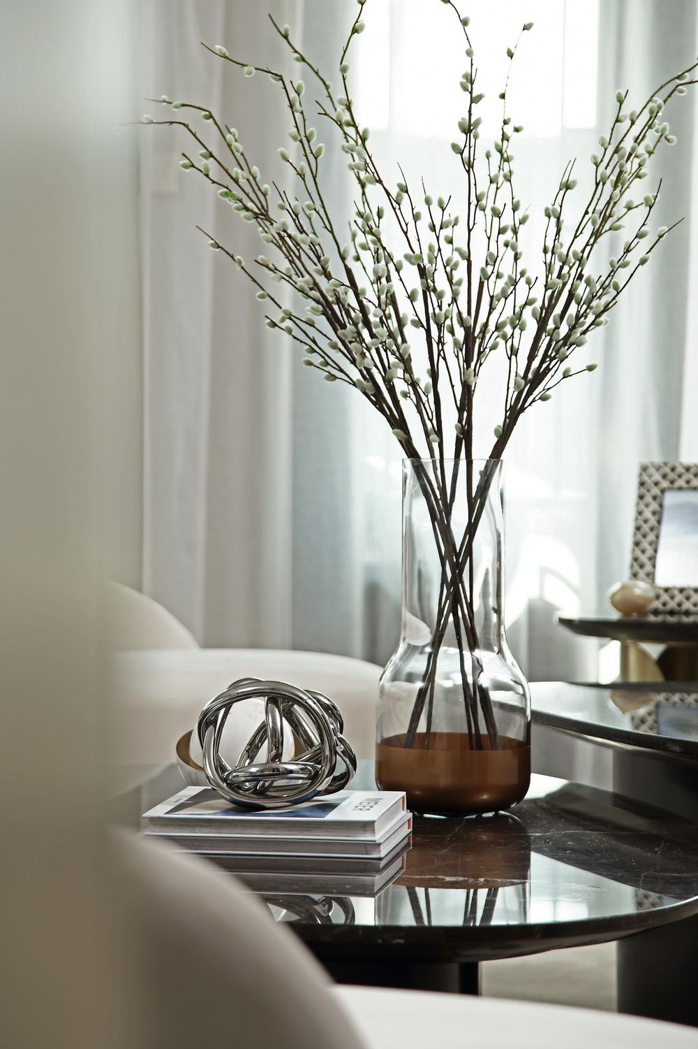 客厅低调奢华中暗藏精致感,大理石、金属和布艺沙发元素等不同属性的材质交织碰撞,空间大而不空,简而不陋。底部留空藏灯带,见光不见灯,营造空间悬浮感,细节满分,更显高级!