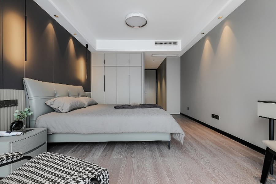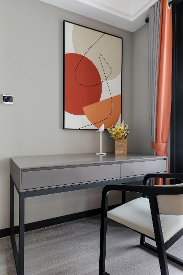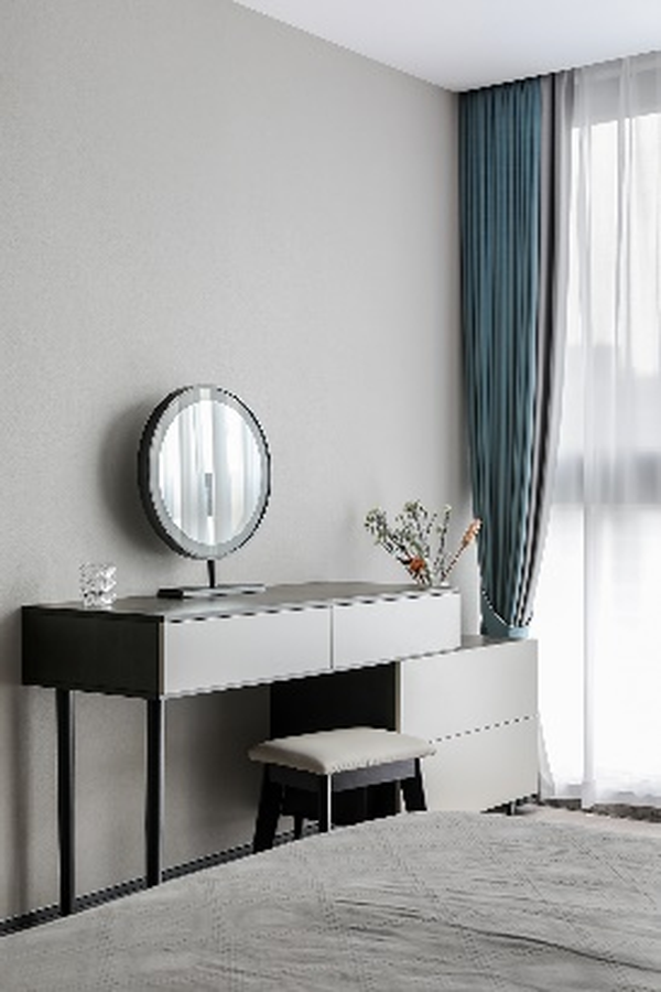 主卧面积比较大,设计师在满足了基本休憩功能后,增加了衣帽间和梳妆台,梳妆台不需要过于浮夸的样式,质感黑白灰与极简的几何设计,创造出空间精致度与质感。