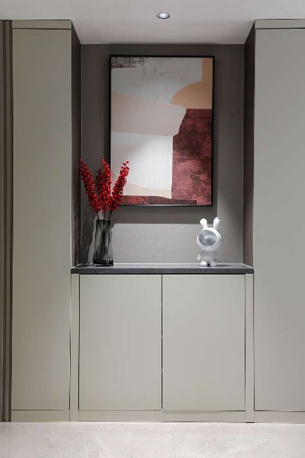 入户便能感受到屋主干净利落的风格,极简的玄关柜除了基础的收纳功能后,并无过多的装饰,灯光为艺术画和摆件、绿植蒙上一层滤镜,仿佛艺术展览。#晒晒你家的玄关