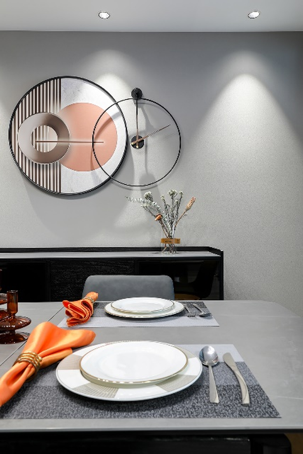 餐厅黑色柜子与大理石岩板餐桌搭配,精致的摆设不经意间便流出屋主骨子里的浪漫因子,视觉感官简洁却舒适。