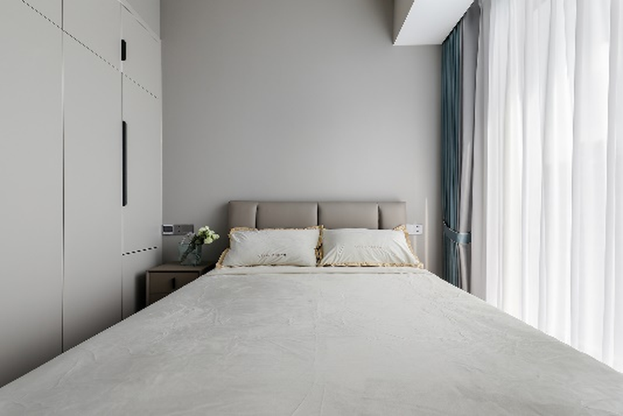 整个主卧的灰色调里,用蓝色窗帘点缀,更显素雅清醒。深灰色饰面作为床头背景,同色系的撞色,更显空间的质感和档次。#如果你也喜欢现代风格