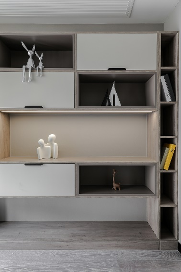 一整墙置物柜,黑白灰恰到好处的搭配,用以摆放各式艺术摆件,赋予了书房更多的个性。