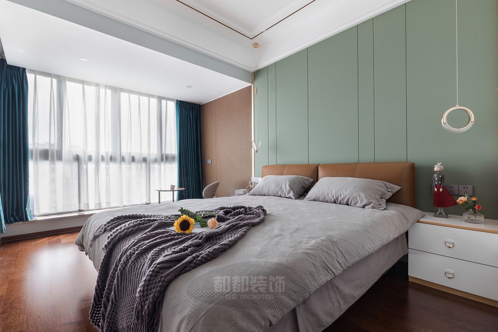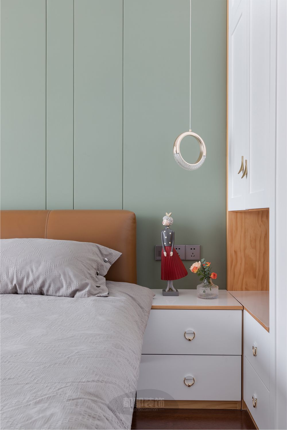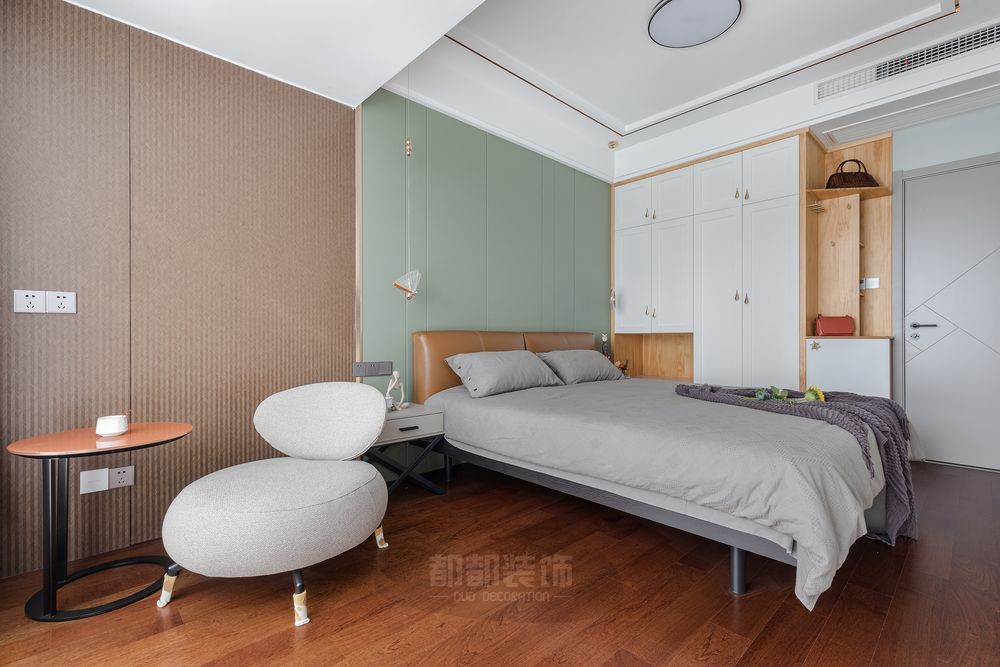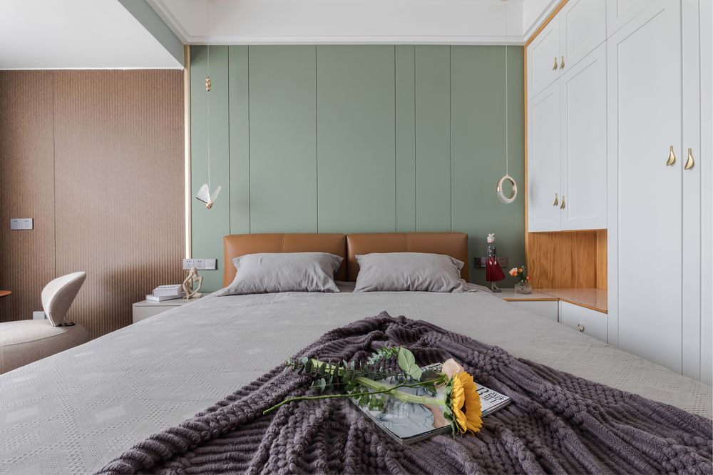 ▲ 卧室风格选择了更为舒适的日系现代风,整体空间由木色和豆绿铺设,点缀以绿植摆件,更多了几分烟火气。