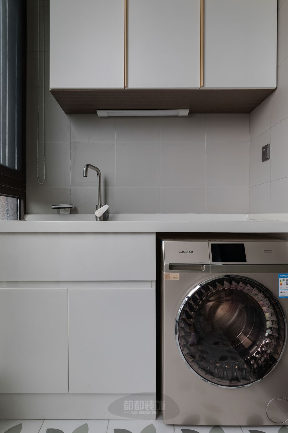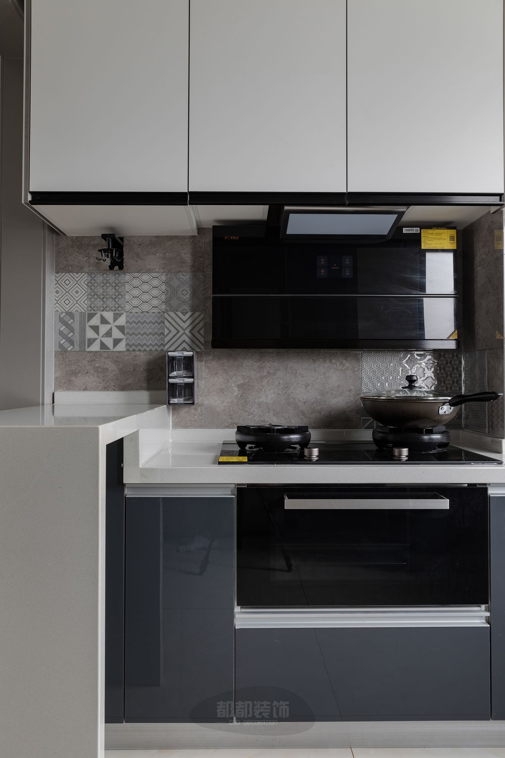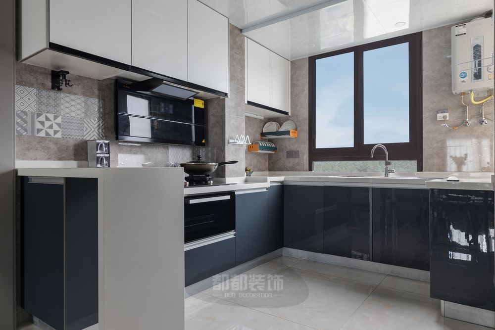 ▲ 厨房U型橱柜采用开放式的设计,白色吊柜简洁大方,与空间融为一体,设计新颖独特,最大程度上提高了空间的利用率。