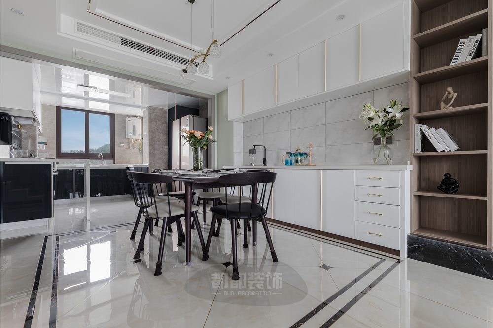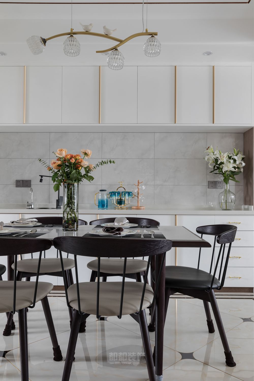▲ 充满质感的黑色餐桌椅,通白吊柜细节处加以轻奢金属点缀,共同构成了温馨清新的餐厅空间。