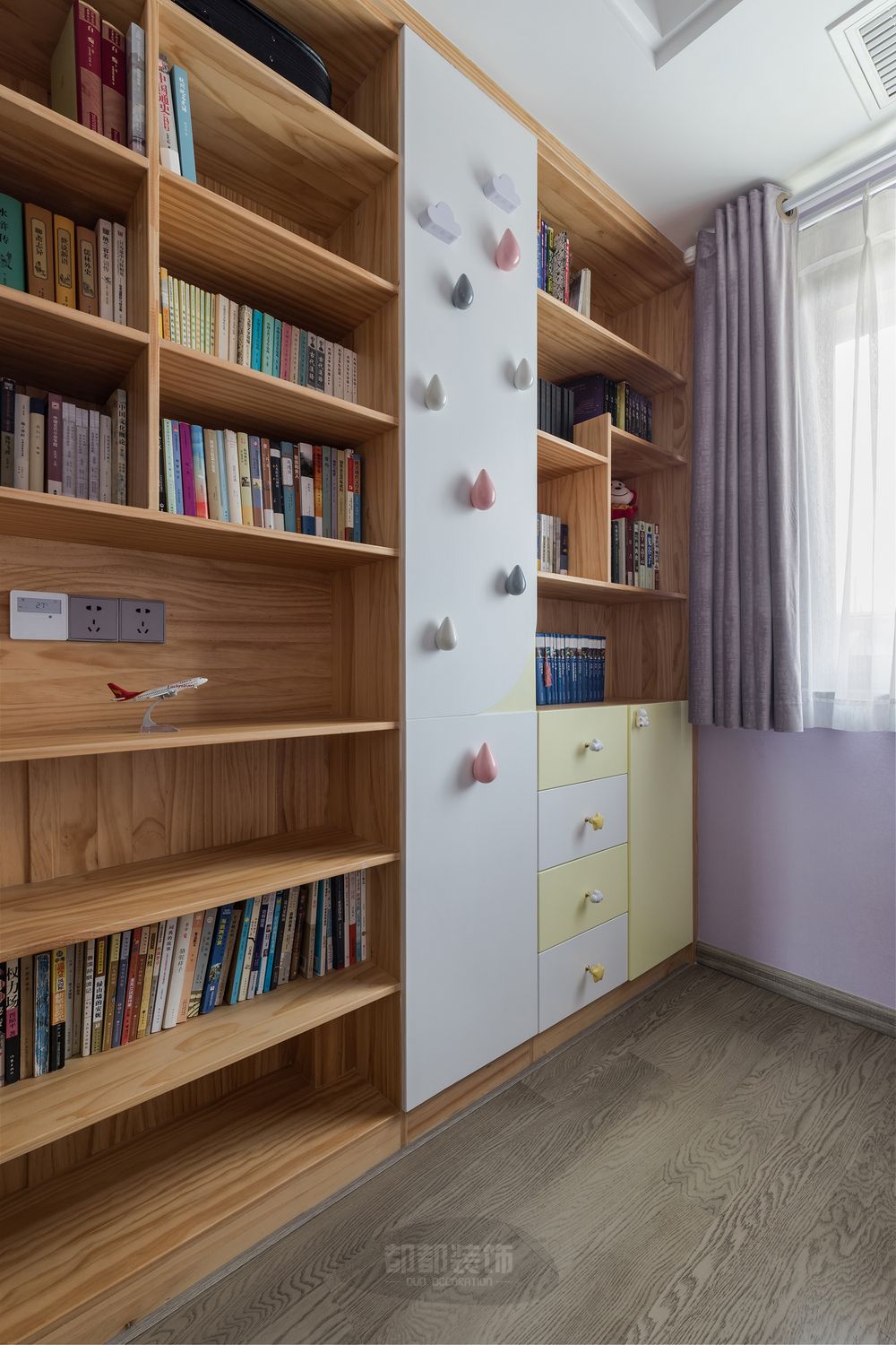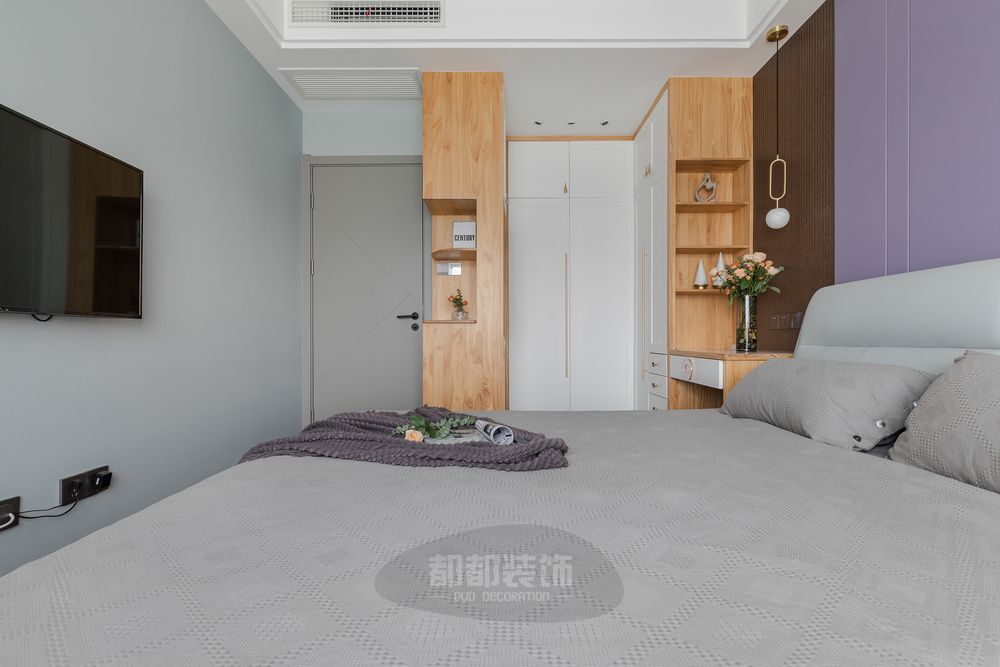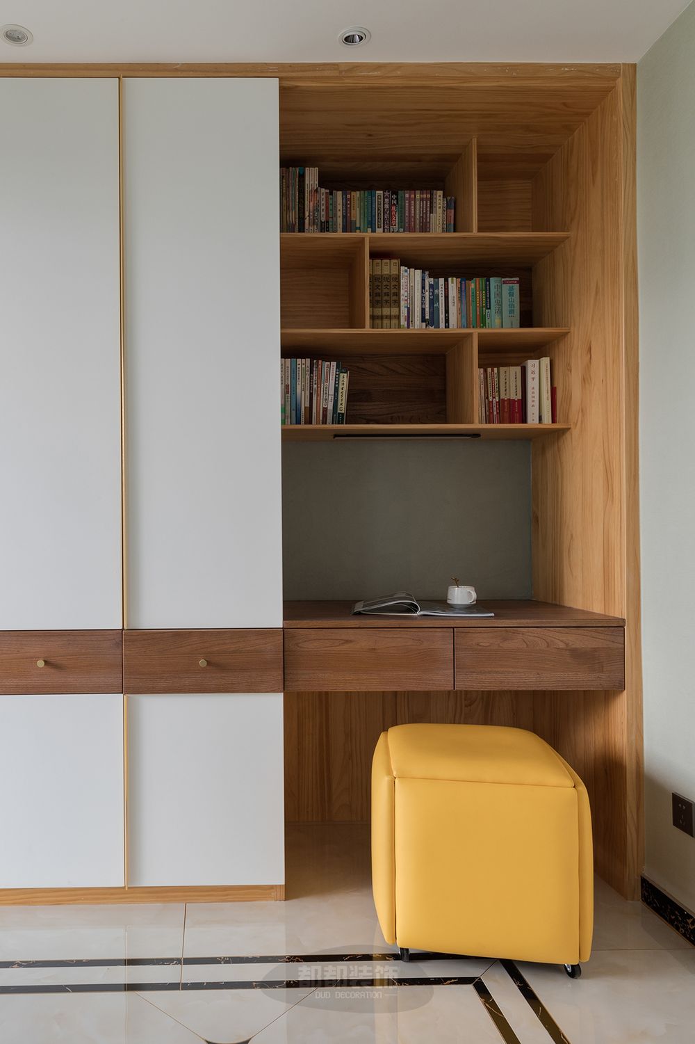 ▲ 次卧延续了主卧的整体风格,以素雅清新为整体风格,搭配以原木定制的不规则储物柜体,完成整体构建。