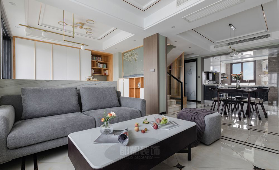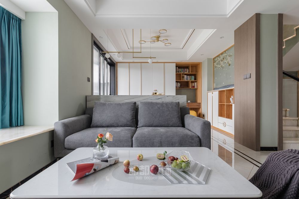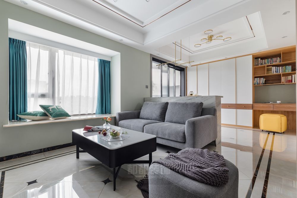 ▲ 客厅的规划设计上摒弃了“沙发+茶几+电视”的传统结构,在光线最好的空间另外规划出一处日式小书房,通过不同风格的吊顶区分后,功能区分割更为明显,空间层次感给为流畅。