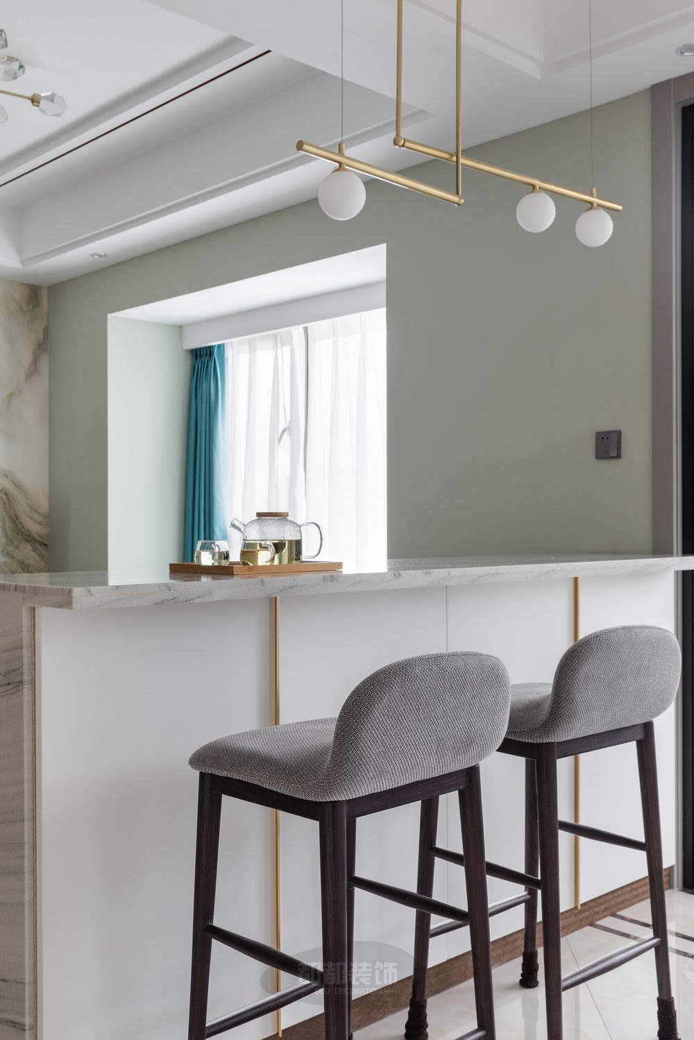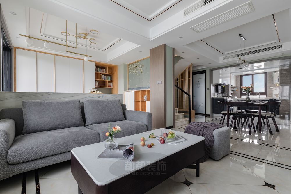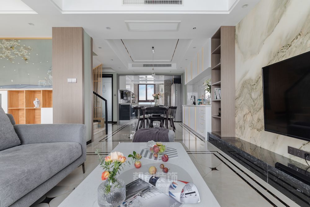 ▲ 餐厅+厨房+客厅分布在一个空间中,没有多余墙体,通过不同的吊顶、吊灯进行区域的划分,更为通透明亮,动线明显流畅。