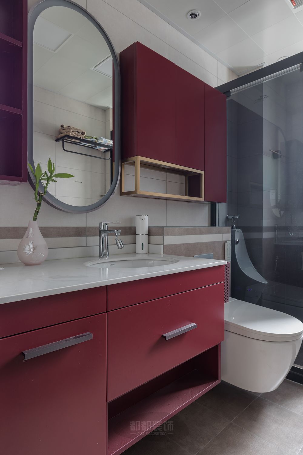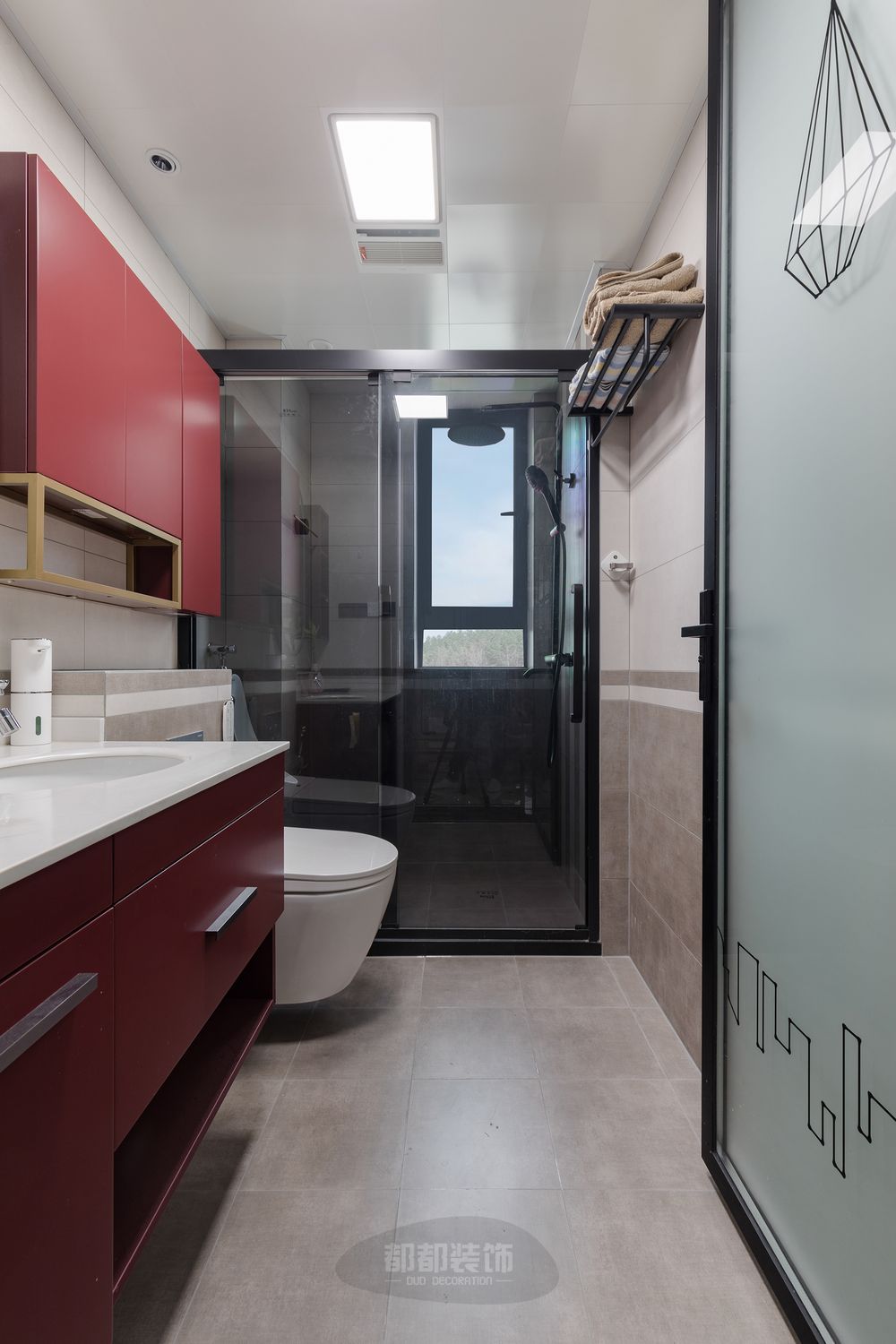 ▲ 卫生间做了干湿分离,整体黑白色调经典现代,分区利用了玻璃隔断,简洁直观,视觉清爽,用黑色金属框作为隔断收边,醒目地勾勒出空间线条。