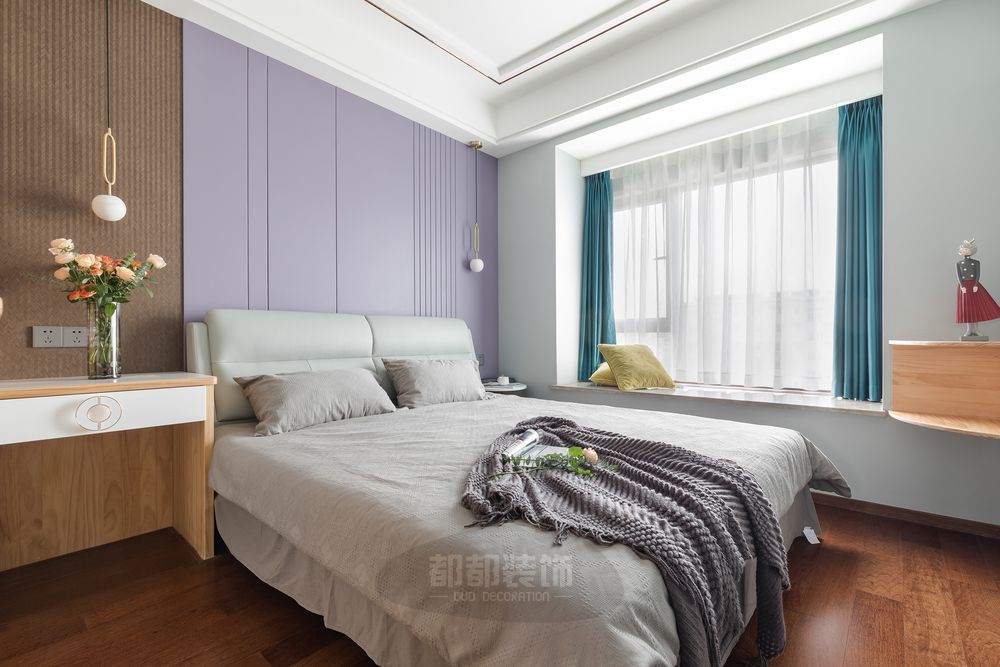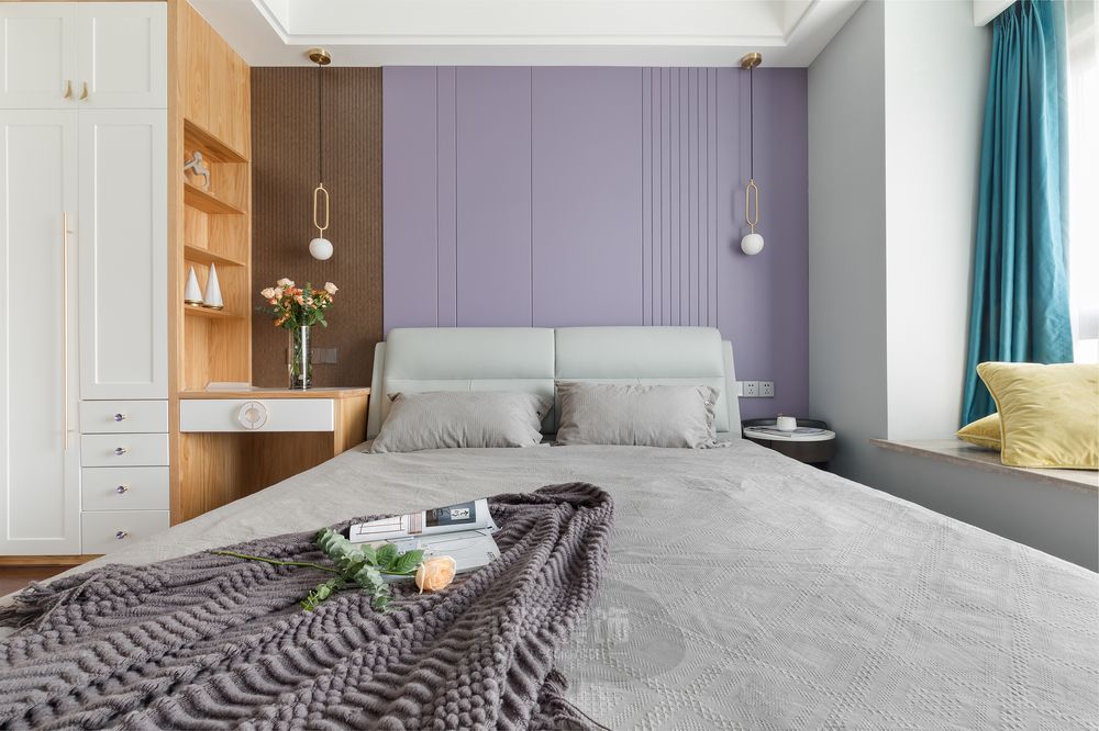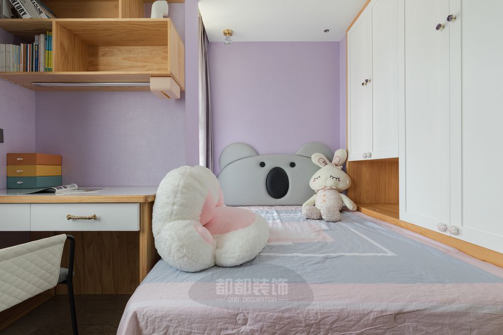 ▲ 儿童房选择了紫芋色,色彩搭配柔和温馨,硬装利落简单,为孩子的年龄增长留有空间,软装配饰并不复杂,但都充满了童趣,尤其是设计师特意挑选的考拉床,深受小朋友的喜欢。