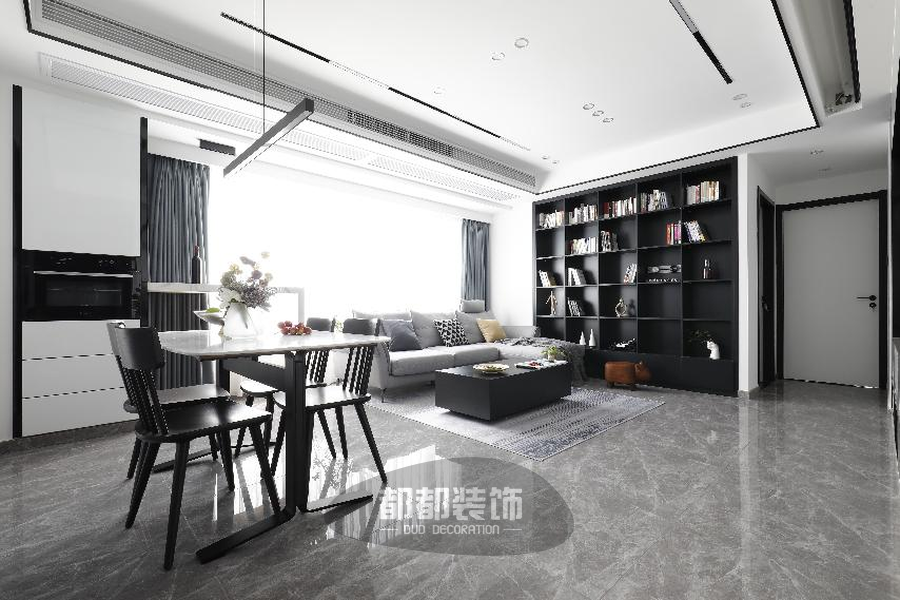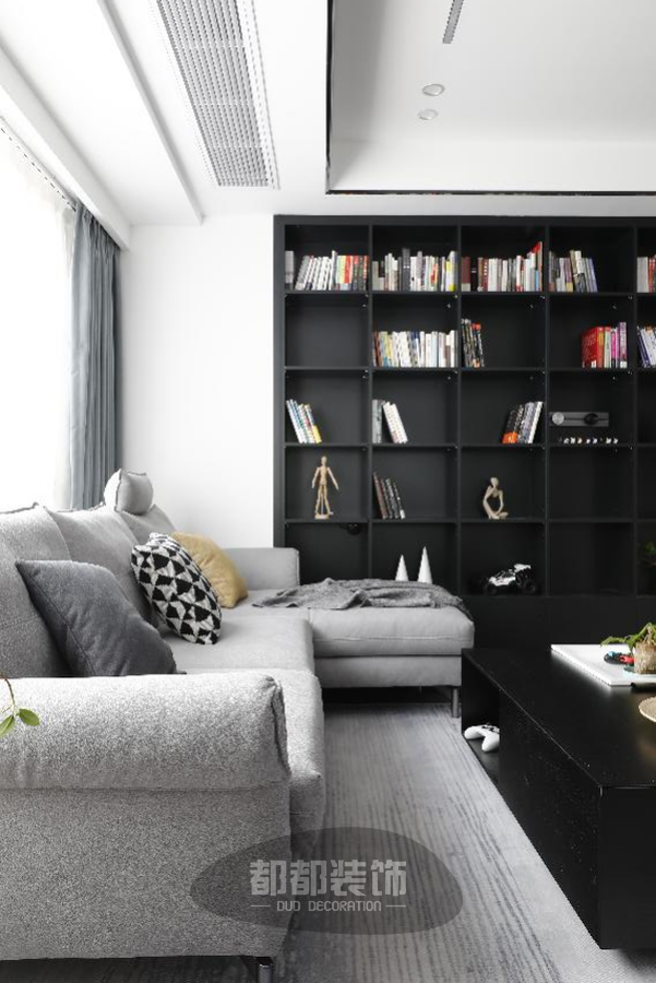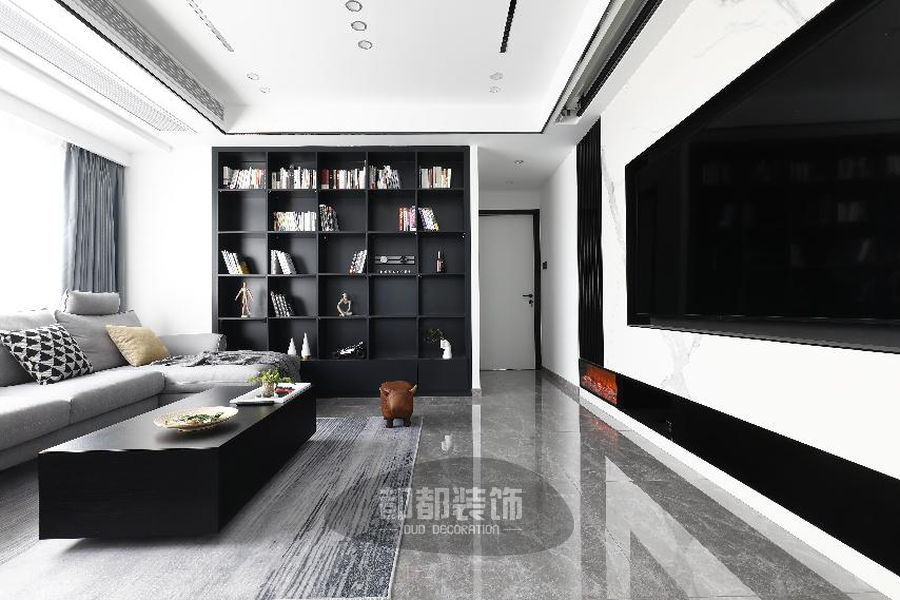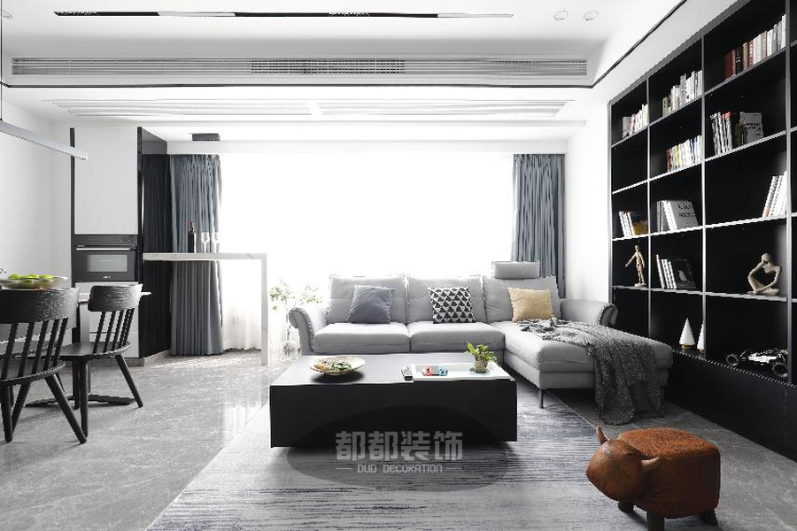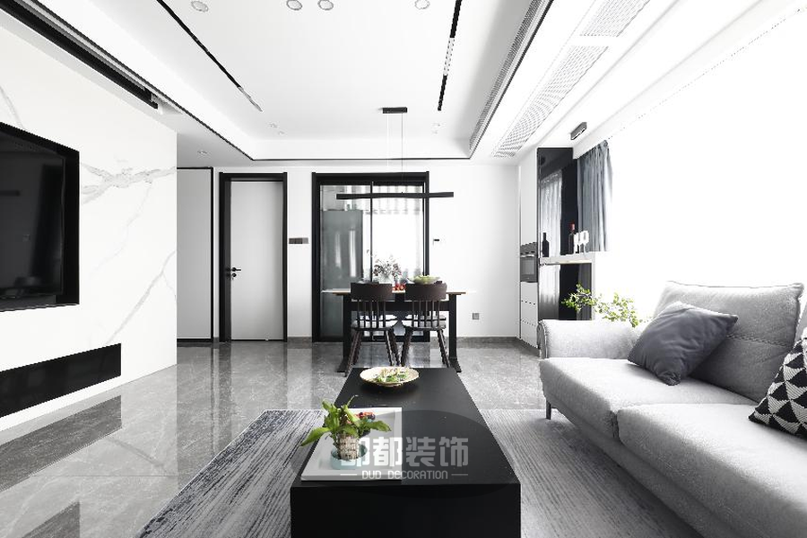 踏步客厅,入目是自带高级感的极简黑白灰,颜色搭配流畅,层次分明,软装搭配得益,局部点缀木质板材和棉麻布艺,简约不简单,使整个空间呈现出一种自在流畅的都市之美。