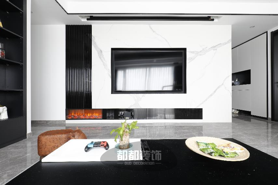 “大理石+格栅板”组合而成的电视墙,完美嵌入墙体、视觉上清爽无压力,大面积的留白运用给予空间更多的包容力,赋予无限的想象。跳动火焰的壁炉装饰打破黑白灰的冷淡,switch游戏机体现了业主的个性趣味。