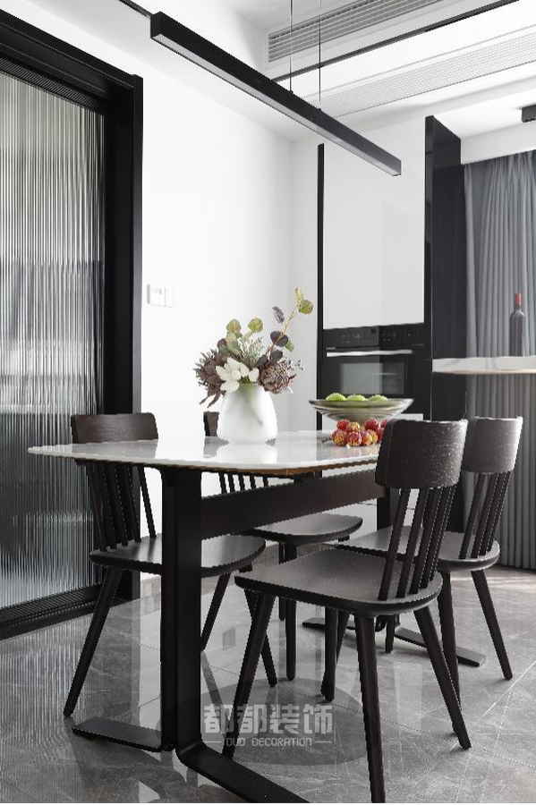 因为业主是独居,餐厅的面积其实并不大,色调保持了与客厅一致的风格,兼顾空间的极简和收纳的充足。