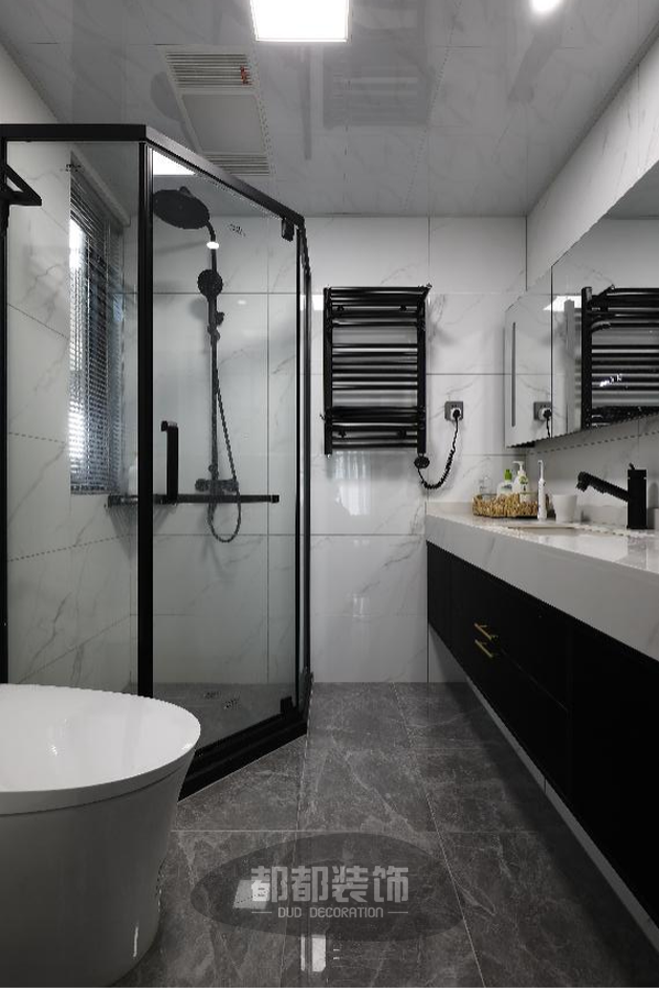 卫生间实现了干湿分离,灰色大理石瓷砖雅致耐脏,黑白系洗手台时尚前卫,淋浴区利用了玻璃隔断,用黑色金属框作为隔断收边,醒目地勾勒出空间线条。