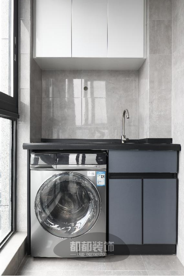 阳台改造为洗衣区,洗衣机、烘干机叠放布置,上面和侧面的柜体可以收纳一些清洁用品。