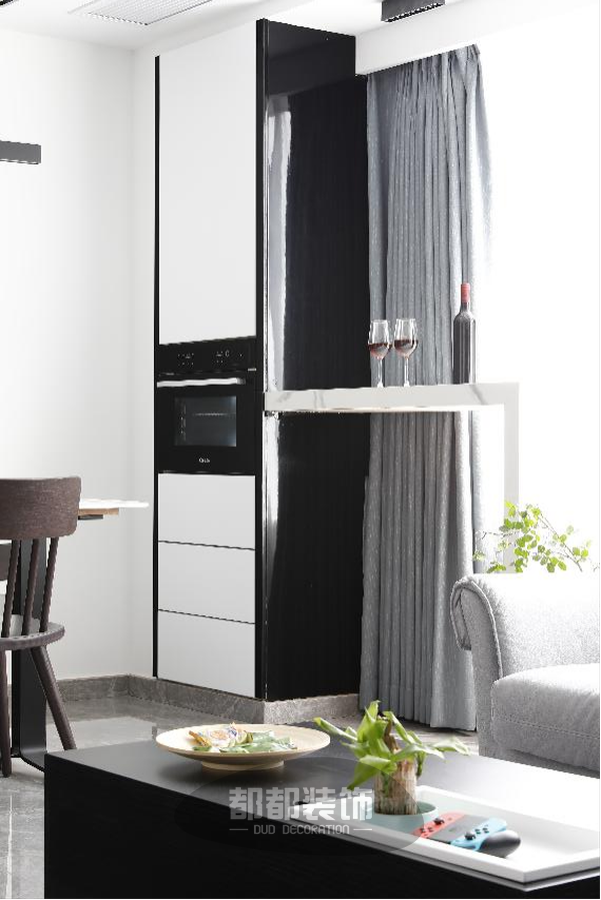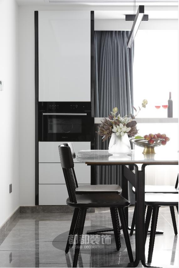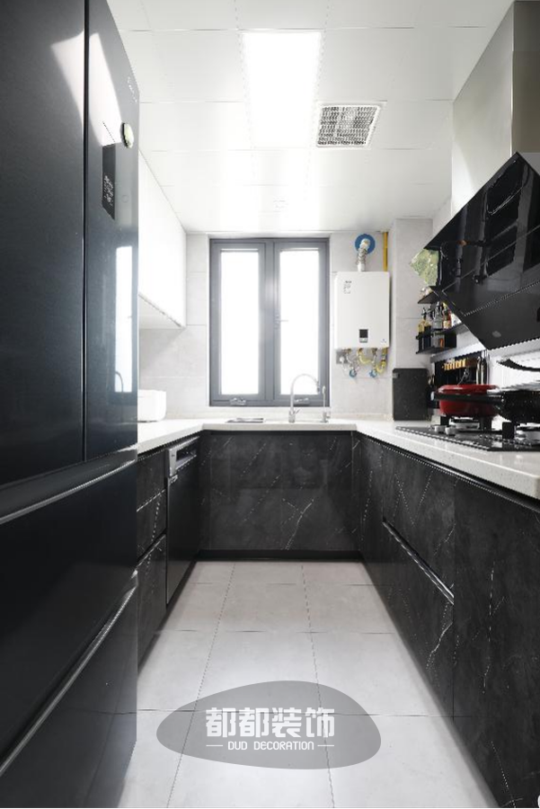 U型厨房同样延续黑白灰风格,上下橱柜大大增加储物空间,水槽、洗碗机、蒸烤箱等一应俱全,方便日常烹饪备餐。