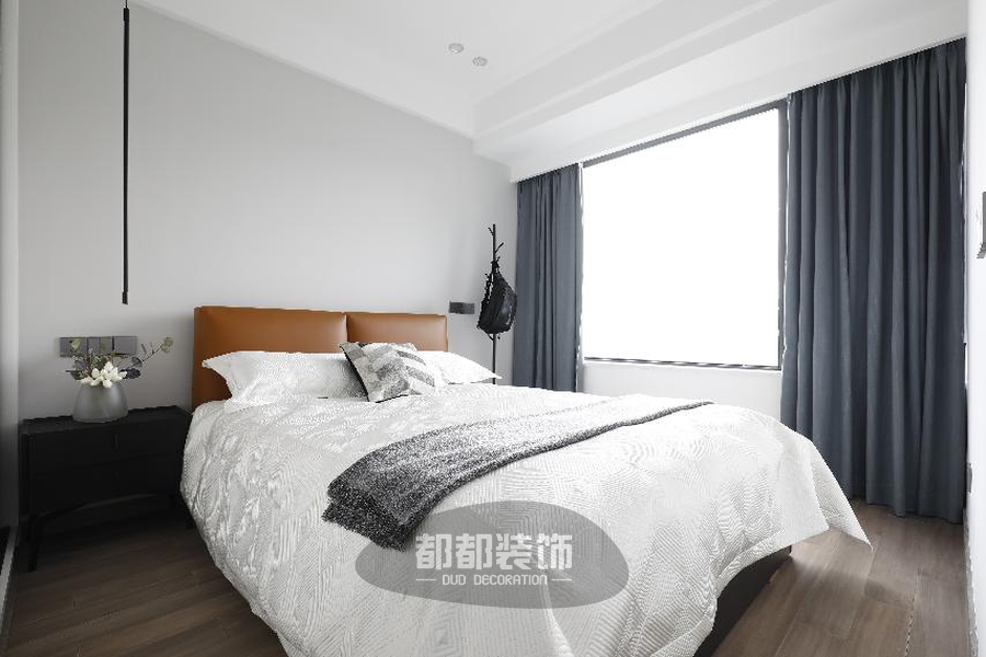 整体色调以高级灰为主,搭配黑色皮质双人床,原木地板返璞归真,灯光做了无主灯设计,不同的灯光分散布置,在不同材质上光影的变化更为高级。