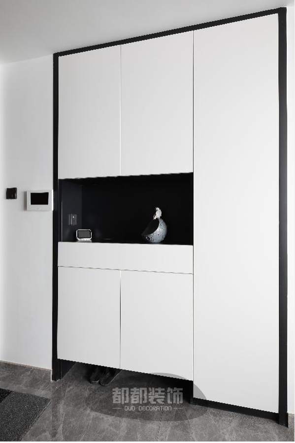 入户是整面嵌墙白色通顶玄关柜,上下封闭,中间留空做隔空带,方便放置随手可以拿取的物品,经过一天的风尘仆仆,换下的外套可以放在右侧的窄柜中。值得一提的是,柜体底部灯带的加入,营造出独属于家的温馨氛围。