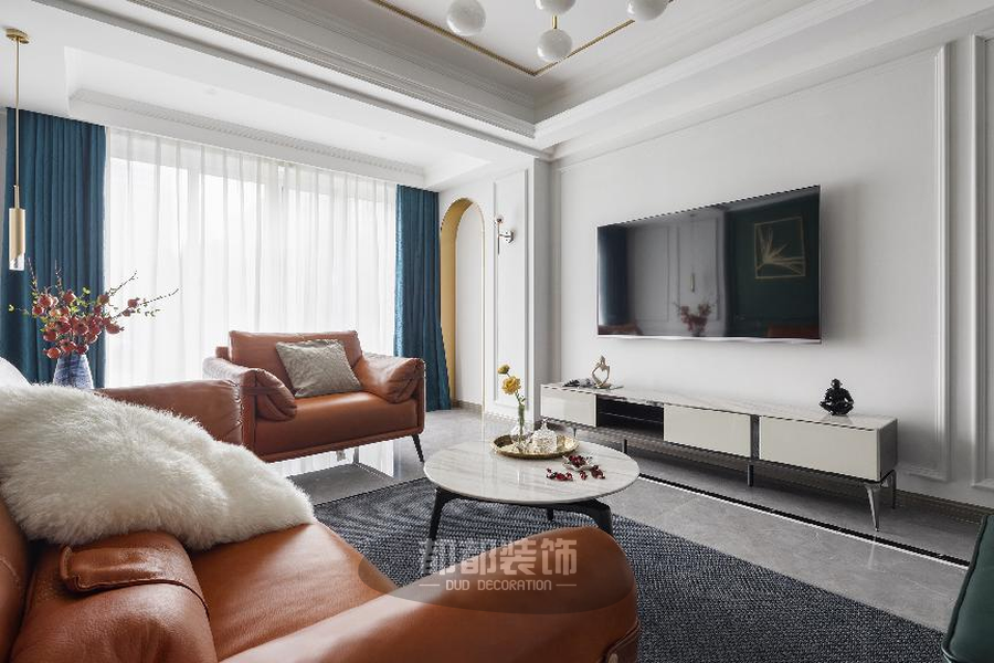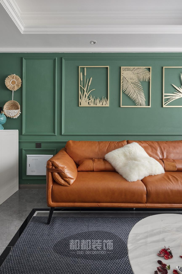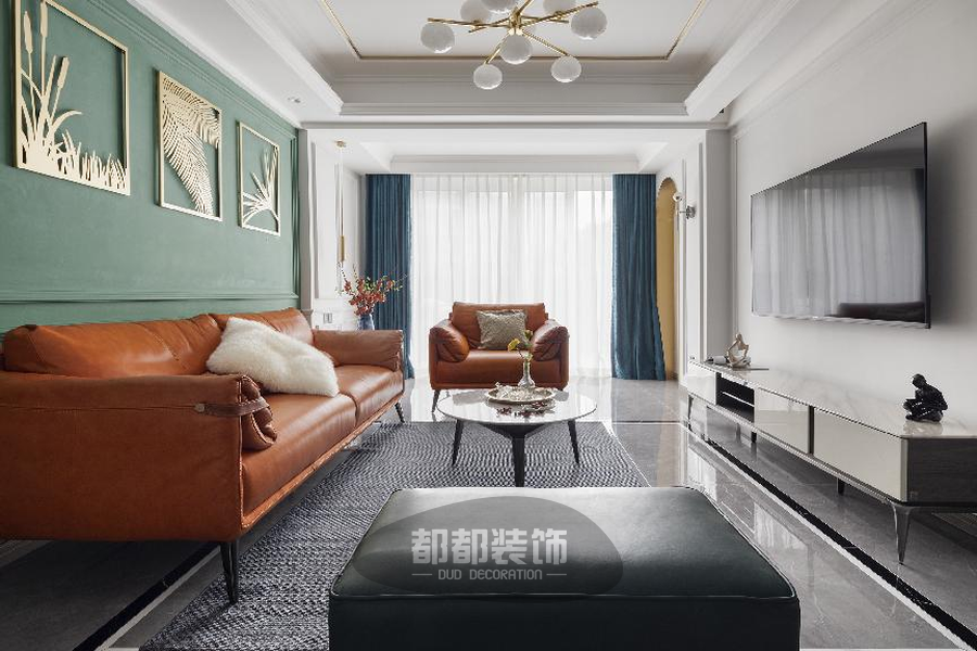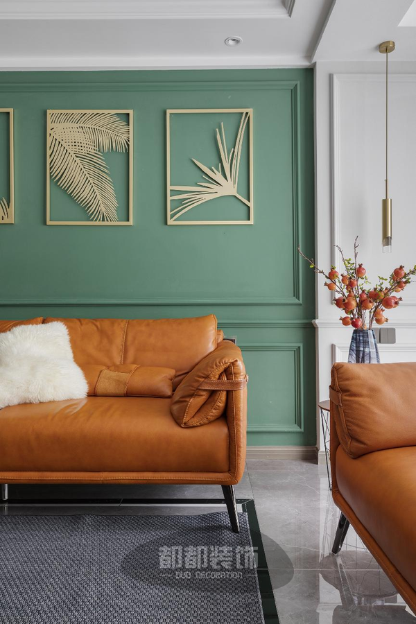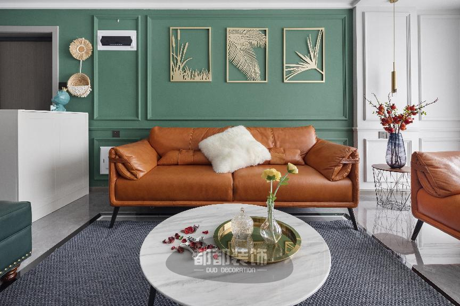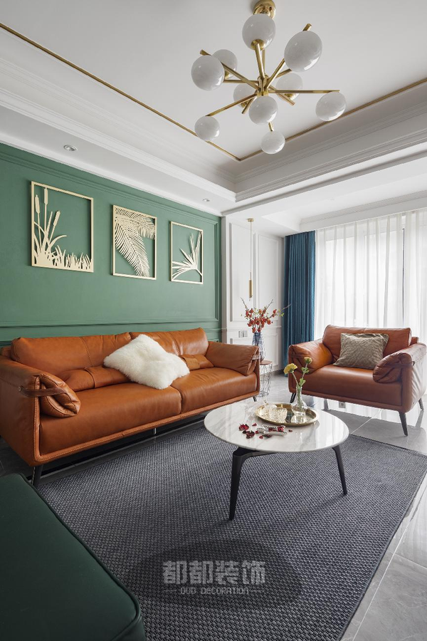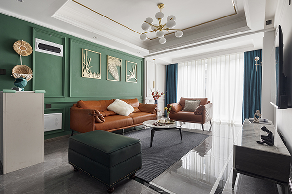 以“绿+白”为底色,清新淡雅,棕橘色皮质沙发造型简单,色调鲜艳,辅以大面积的蓝白窗帘,给人带来了极强的视觉冲击感。