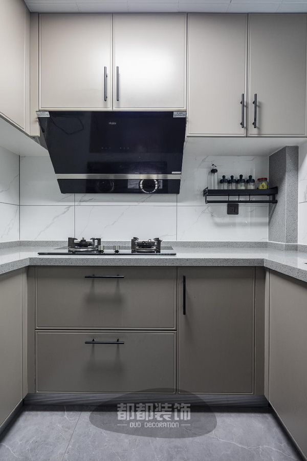 厨房U型布局,整体以高级灰为主色调,简约清新,大小家电使用嵌入式设计,让空间更显宽敞大气。