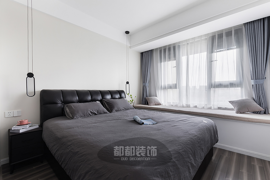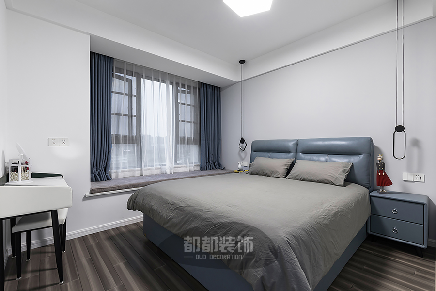 次卧延续了主卧温馨低调的风格,以功能性和实用舒适为考虑的重点,低饱和的“灰+蓝”布艺床品与木质地板相辅相成,整个空间宁静幽雅。