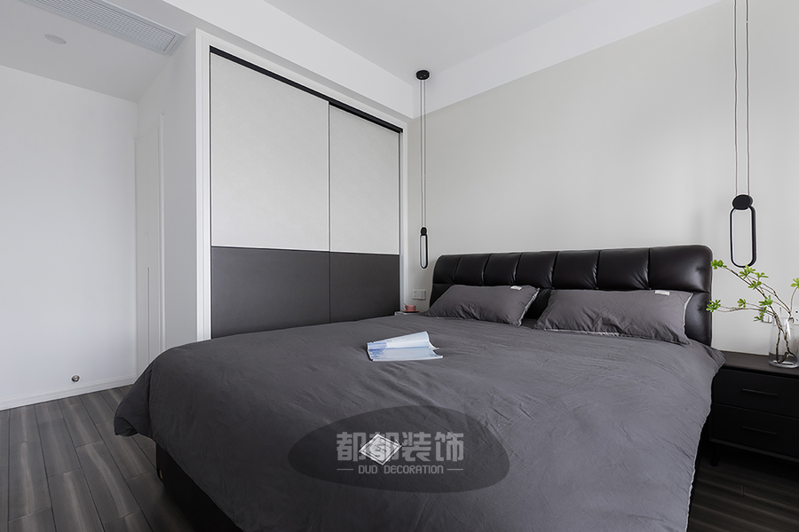卧室并未选择过分靓丽的颜色,顶天立地的衣柜简洁不失线条美,空间内所有家具都选择了浅灰或灰白色调,共同营造一个自然舒适的睡眠空间。