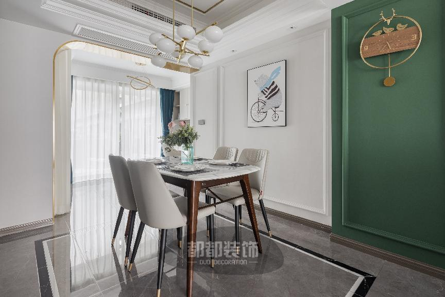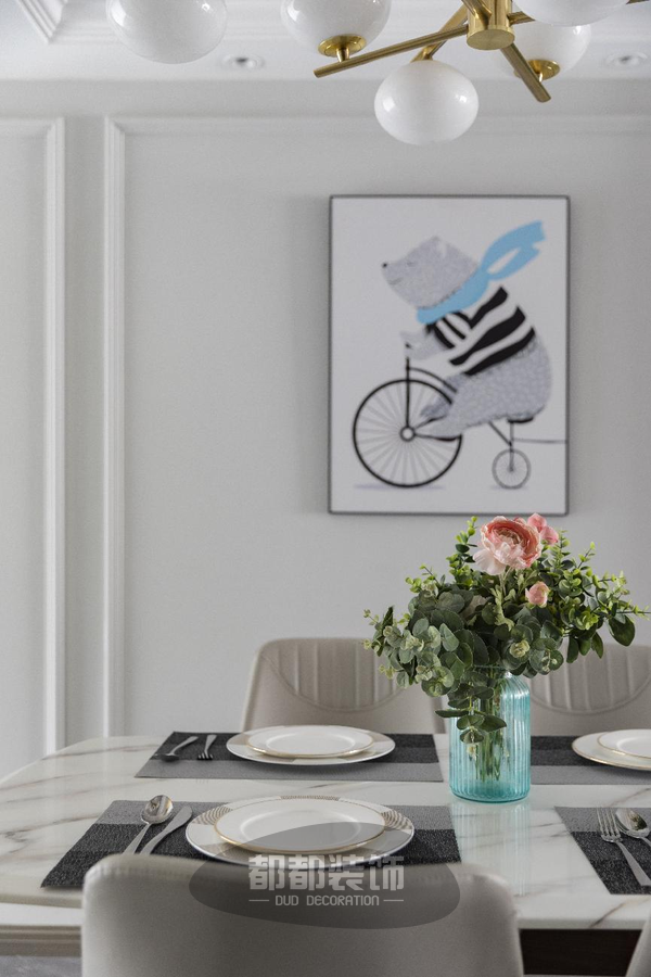 客餐厅全部打通,整体呈开放性布局,空间强调简洁、明晰的线条布局,在保留传统美式舒适自由的精髓下,融入了现代的时尚,从而勾勒出优雅摩登的视觉感染力。
