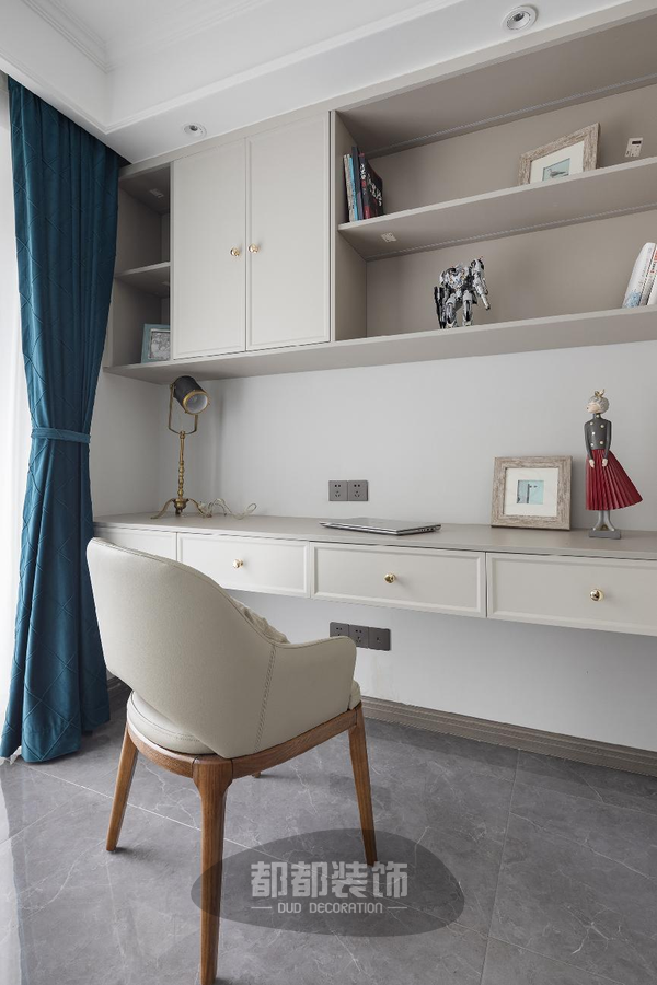 利用阳台赠送面积规划出一个小小的书房,米白色素净温馨,经典的上柜下桌设计,有效地利用了空间,柔和的阳光从落地窗外洒入,不管是学习还是工作,都成为了一种享受。