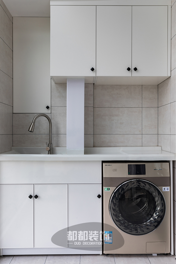 顶天立地的白色储物柜实用能装,承包了阳台区域的收纳需求,底部预留空间,嵌进了洗衣机和烘干机,洗晒功能全部得到实现,缔造出兼具颜值与实用的区域。。