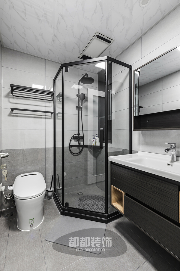 卫生间做了干湿分离,“磨砂黑色+高级灰”的搭配,低调耐看,大理石台面利落有型,实现对空间区域最大利用化,也力求功用与美学的完美融合。