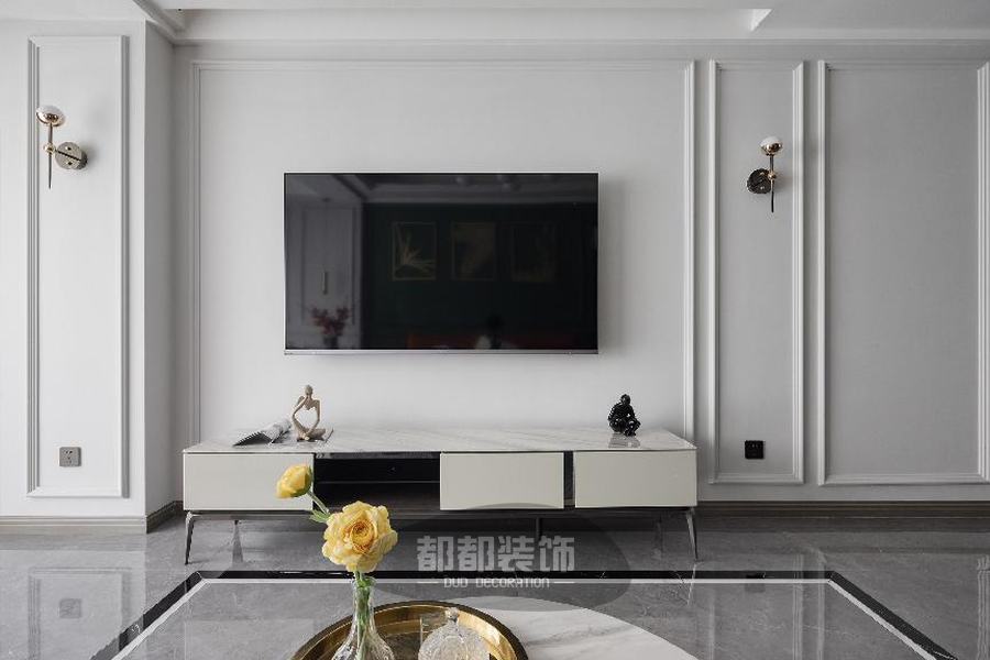 电视墙以大白墙为主,两侧以不规则的石膏做层次感,左侧的拱门型设计,可以直通次卧的晾晒区,做到了将美感与功能兼顾。