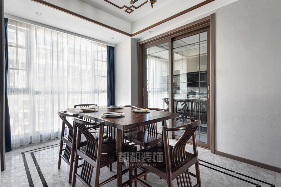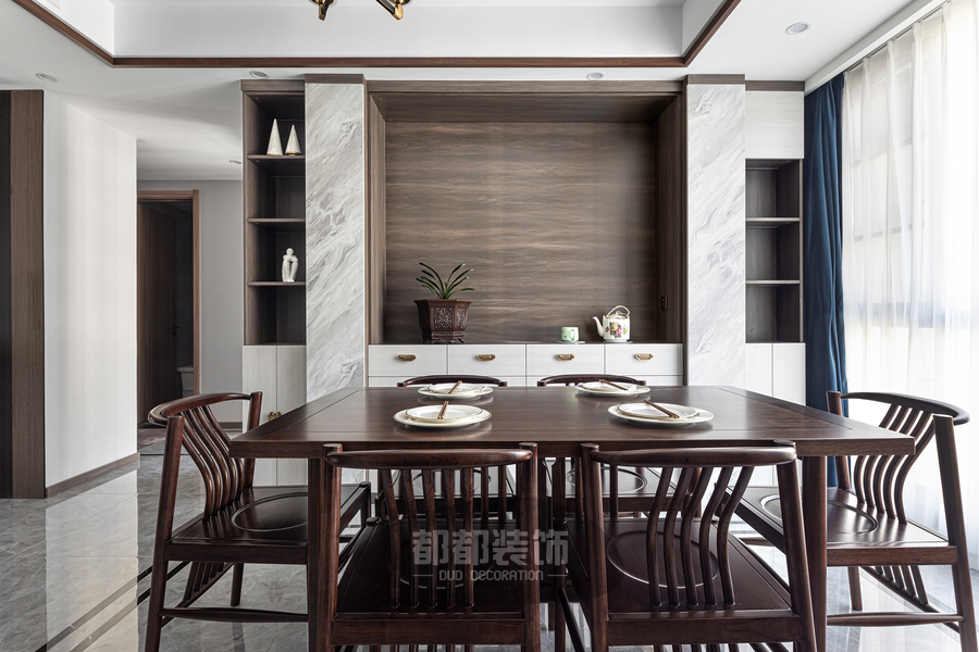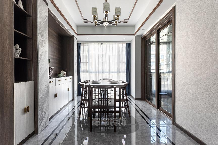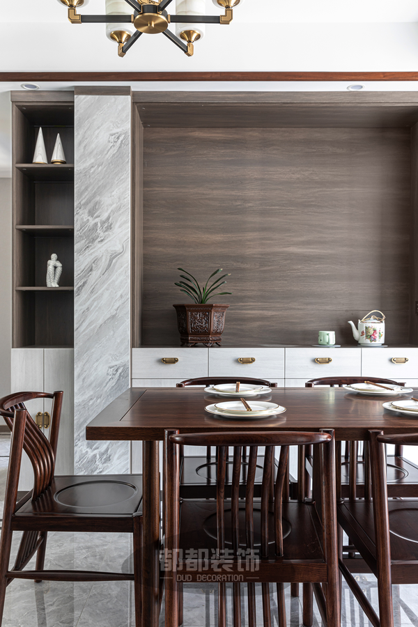 餐厅空间简约大方,一盏暖色吊灯烘托出温馨氛围,新中式金檀木餐桌搭配6把月牙椅,深沉的颜色稳重大气,入目光泽柔美,触感温润如玉,在古典优美的韵味中享受惬意的美好。