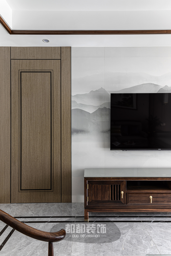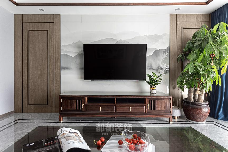 电视墙以一幅水墨画作做底,山川连绵的诗意之美,黑白两色的水墨笔锋,营造了不拘一格的淡雅气韵,一侧的发财树优美翠绿,大俗即大雅,不仅能美化家居环境,还给生活带来招财纳福的美好愿景。