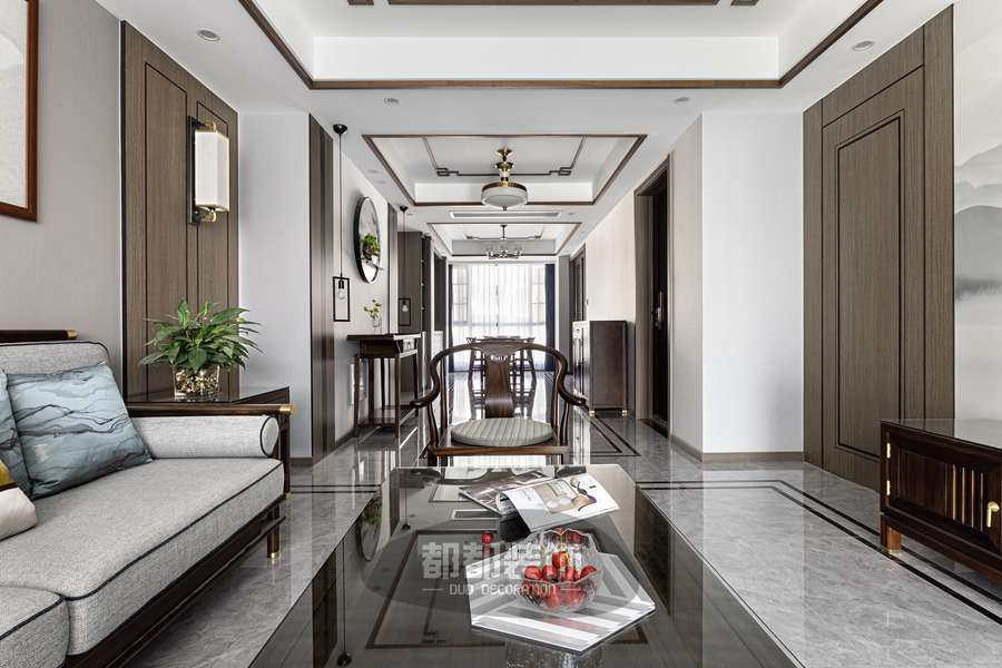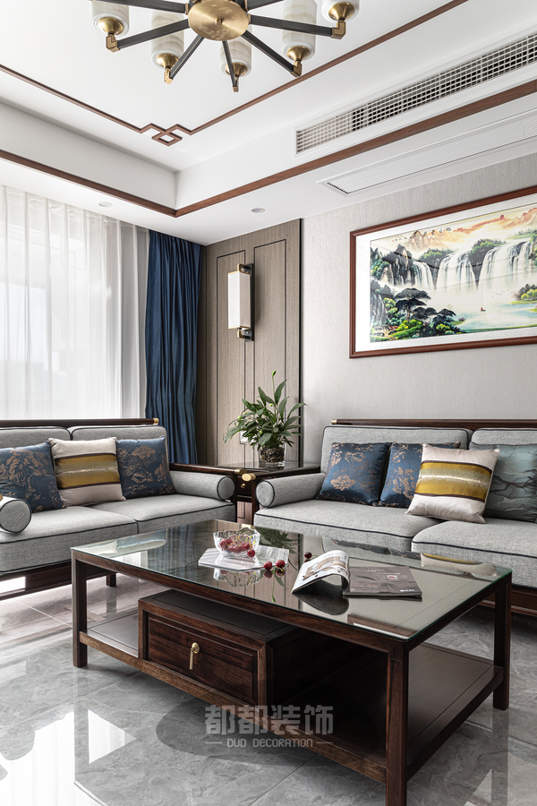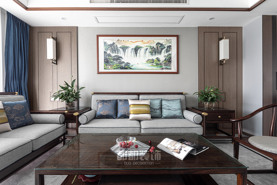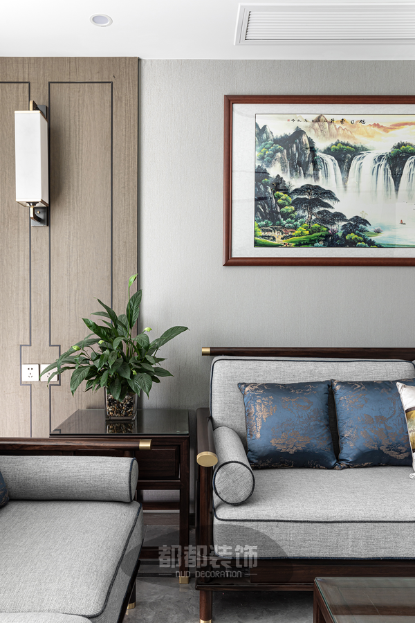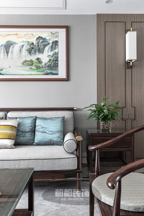 实木的新中式家具圆润有质感,设计上化繁为简,线条流畅,让空间更具有延展性,素雅沉稳的灰色与深棕色的木色相搭,极具意境和东方韵味,为客厅带来宁静祥和的感觉。