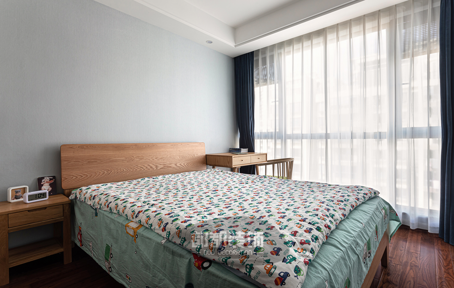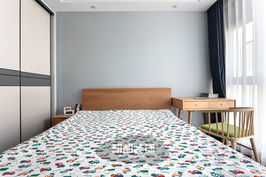 儿童房的装修自然清新,家具的定制沉稳大气又不失童趣,略带弧形设计打磨的圆润细腻,触感丝滑,每个细节都安全指数五颗星。